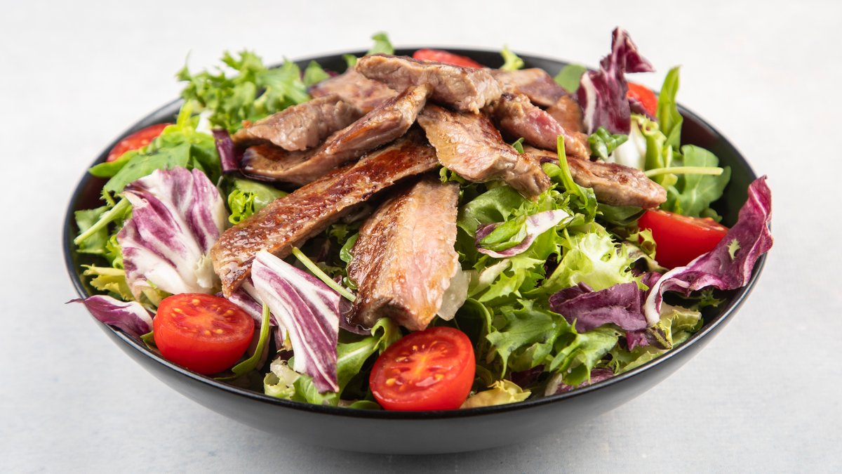 Salata sa dimljenim lososom i limun dresingom (mix zelenih salata, kolutići crvenog luka, čeri paradajz, masline, limunov sok, losos)