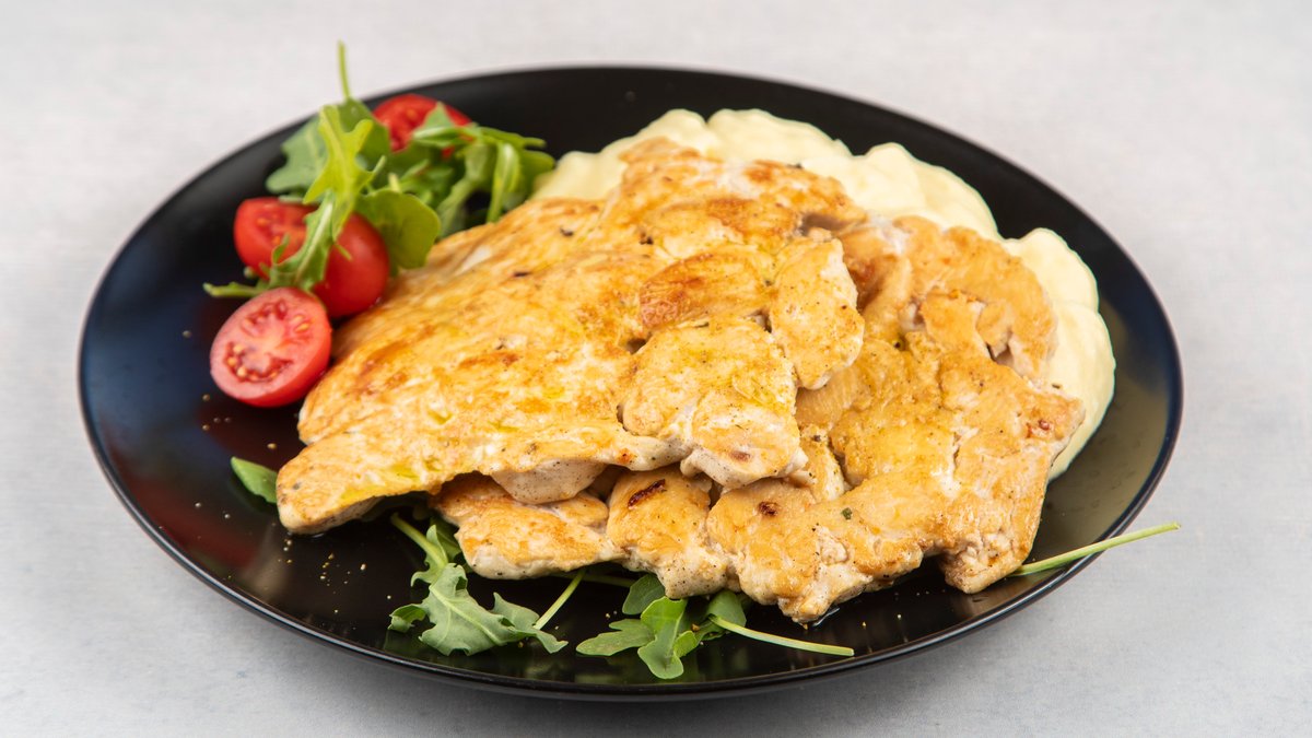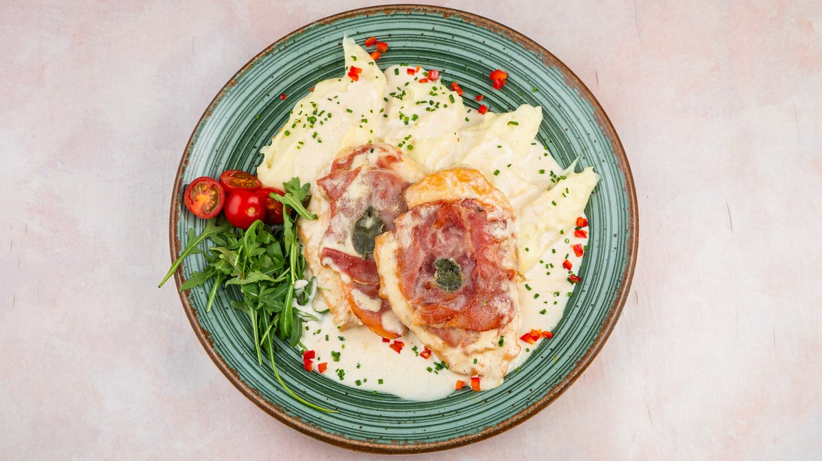 pileći file 250g, pršuta, žalfija, limunov sok, neutralna pavlaka, pire krompir, rukola, čeri paradajz