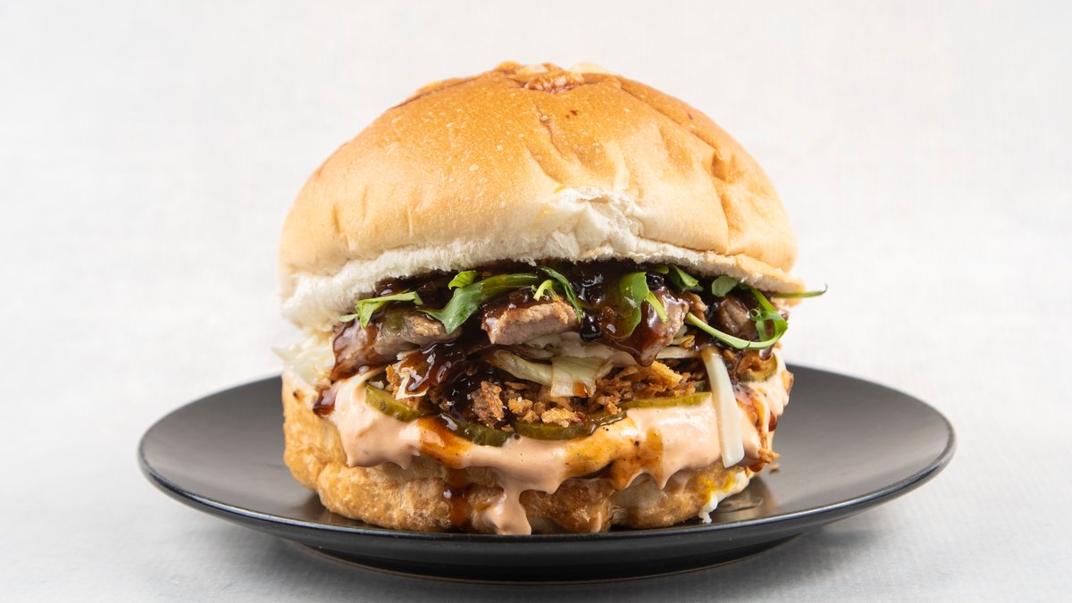 Zemička bez susama, dupla hrskava slaninica, čedar sir, dehidrirani crni luk, kiseli krastavac, kečap, senf, govedina 2x50g, burger sos