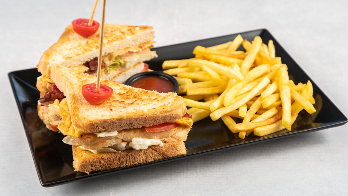 Tostirani hleb, grilovana piletina, omlet hrskava slaninica, iceberg salata, paradajz, majonez
