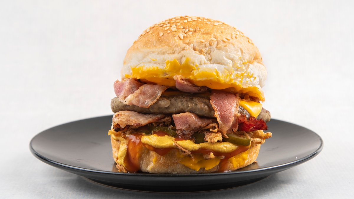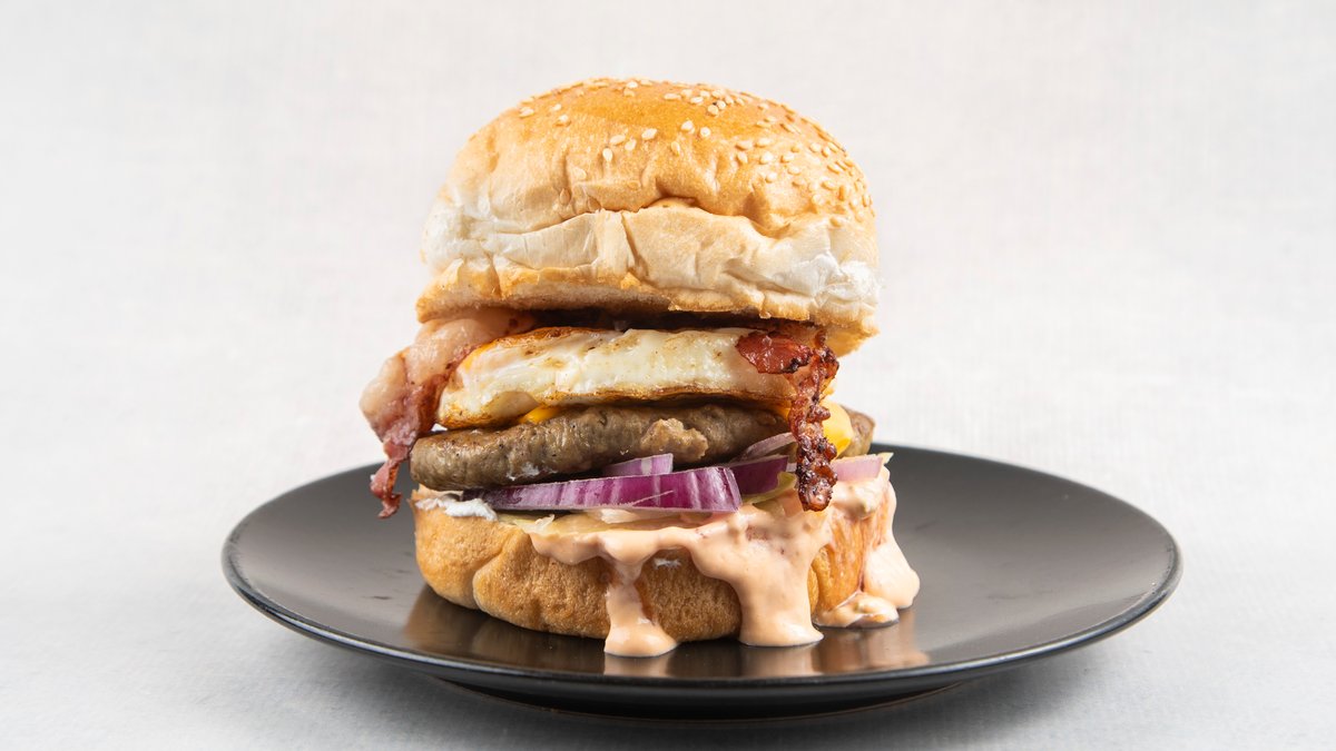 Zemička sa susamom, govedina 90 grama, jaje, slanina, pavlaka, kečap, crveni luk, burger sos, iceberg salata, topljeni sir