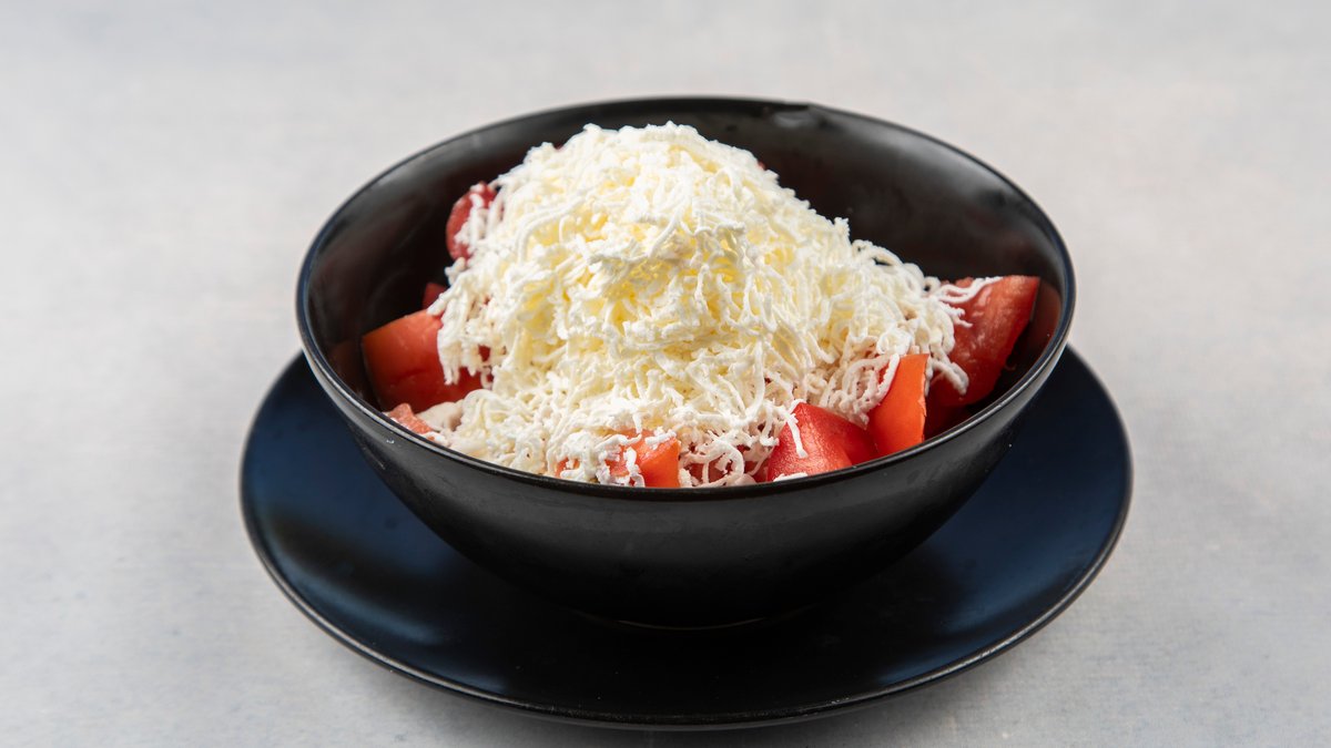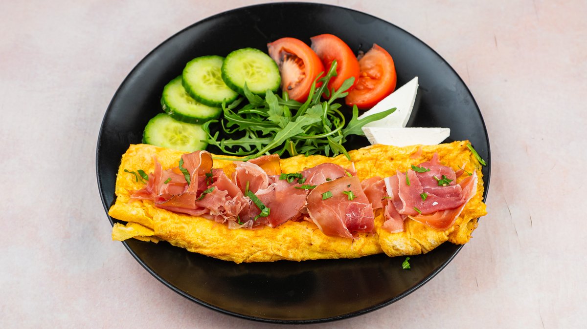 3 jajeta,kačkavalj, dimljeni vrat, feta sir, paradajz, krastavac I somun