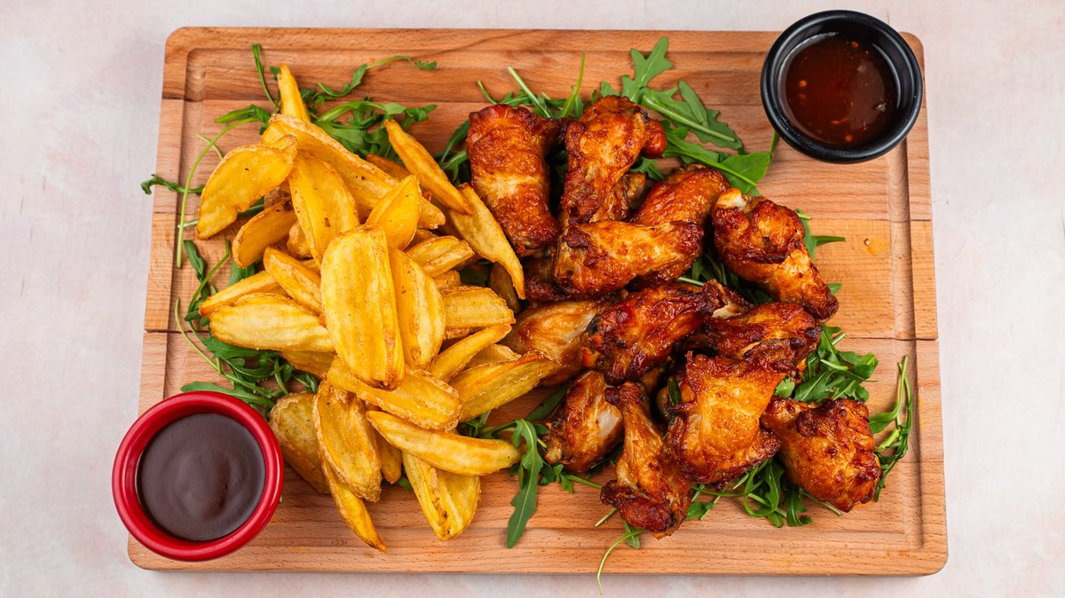 pileća krilca 250g, krispi krompir, bbq sos, sweet cari sos, rukola