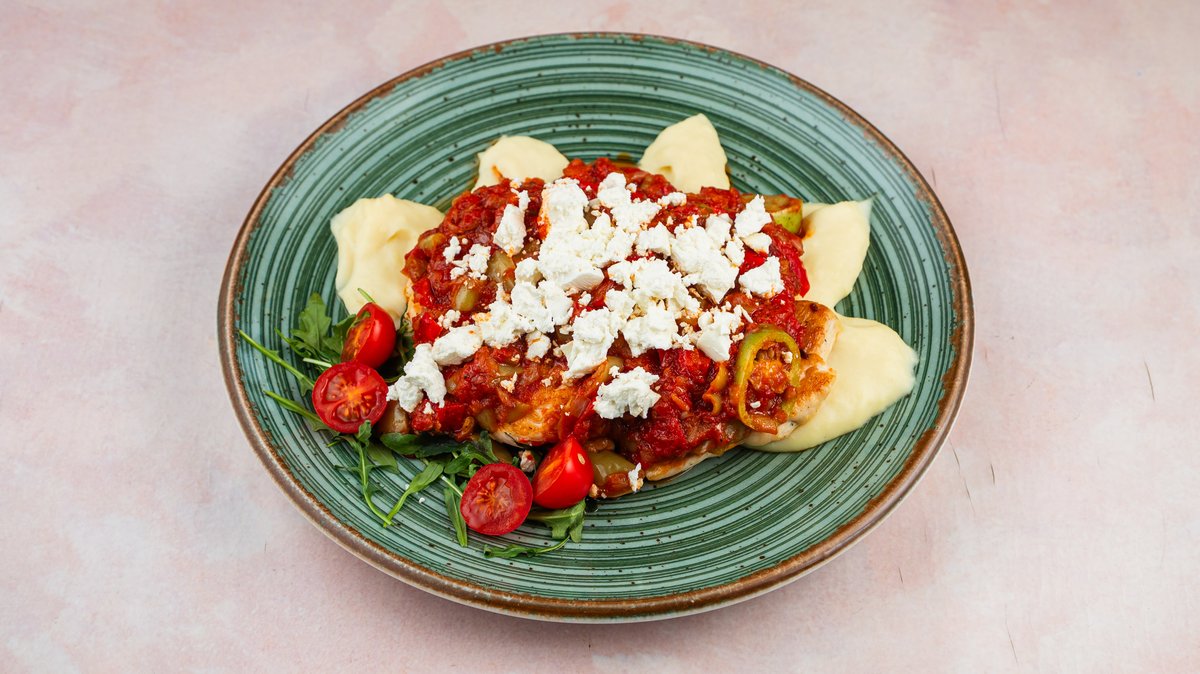 pileći file, napolitana sos, dinstano povrće, pire krompir, ljuta papirka, feta sir, peršun