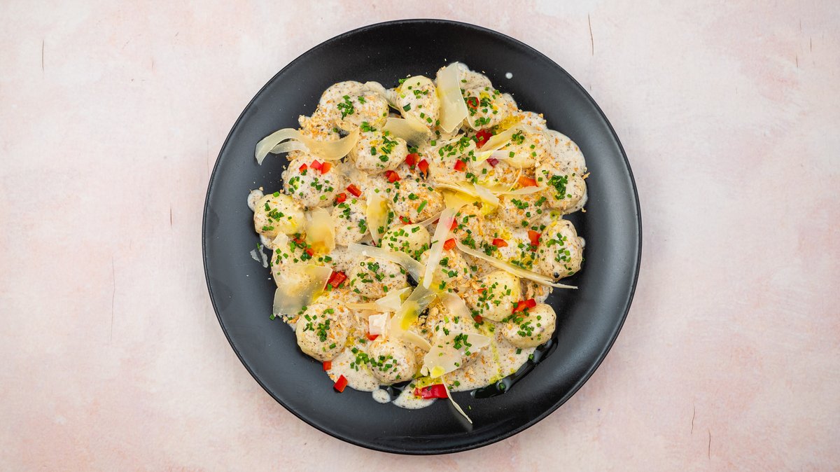 crna tartufata, tostirane panko prezle, vlašac i ulje od kurkume, neutralna pavlaka