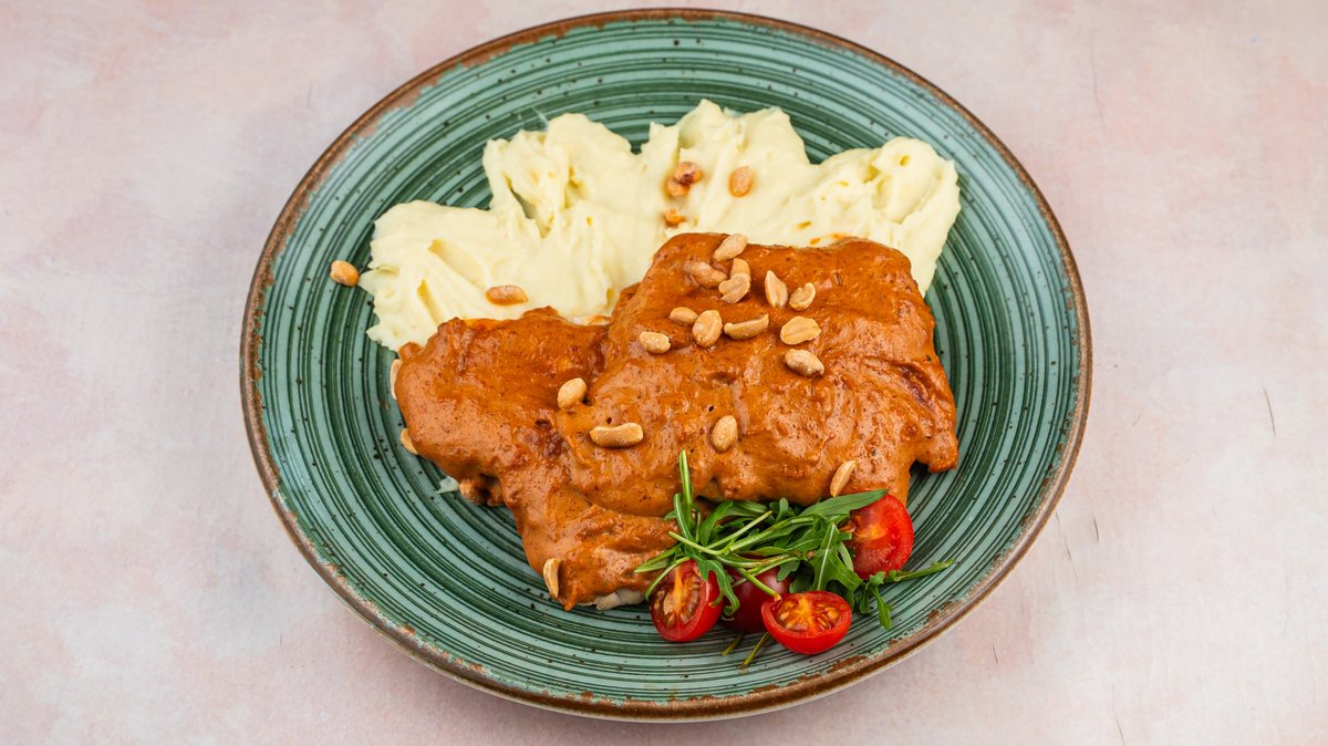 pileći file, kikiriki sos, pire krompir, rukola, čeri paradajz