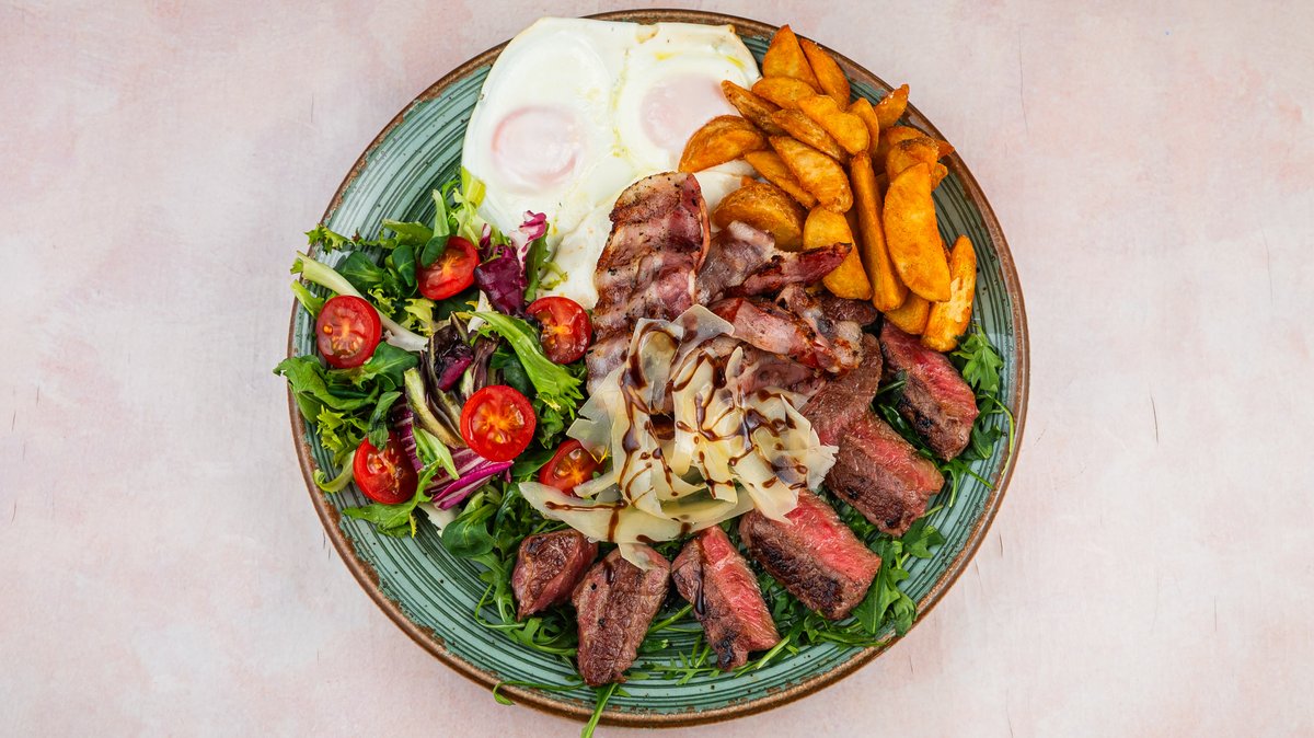 3 pržena jaja, grilovani ramstek preliven maslinovim uljem, aceto kremom, sa piliranim parmezanom, utopljen sa mix salatom, rukolom, prženom slaninicom i začinjenim krompirom