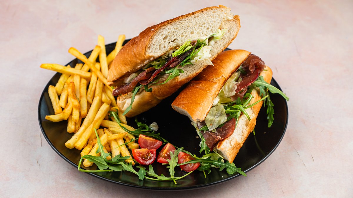 kifla, maslac, garlic sos, iceberg salata, paradajz, rukola, goveđa pršuta