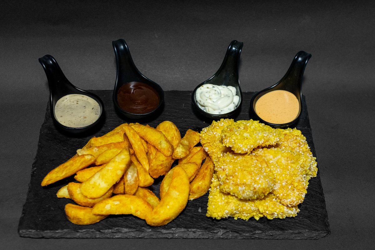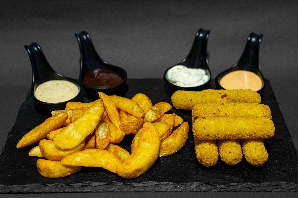 Hrskavi pileći stapići 200g, Pohovani mocarela sir 250g, Vedges 200g, 3x sos po izboru
