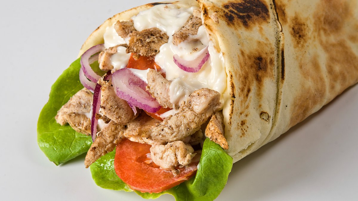 Pileća shawarma, falafel, humus, tahini,kornišoni i paradajz u pita hlebu