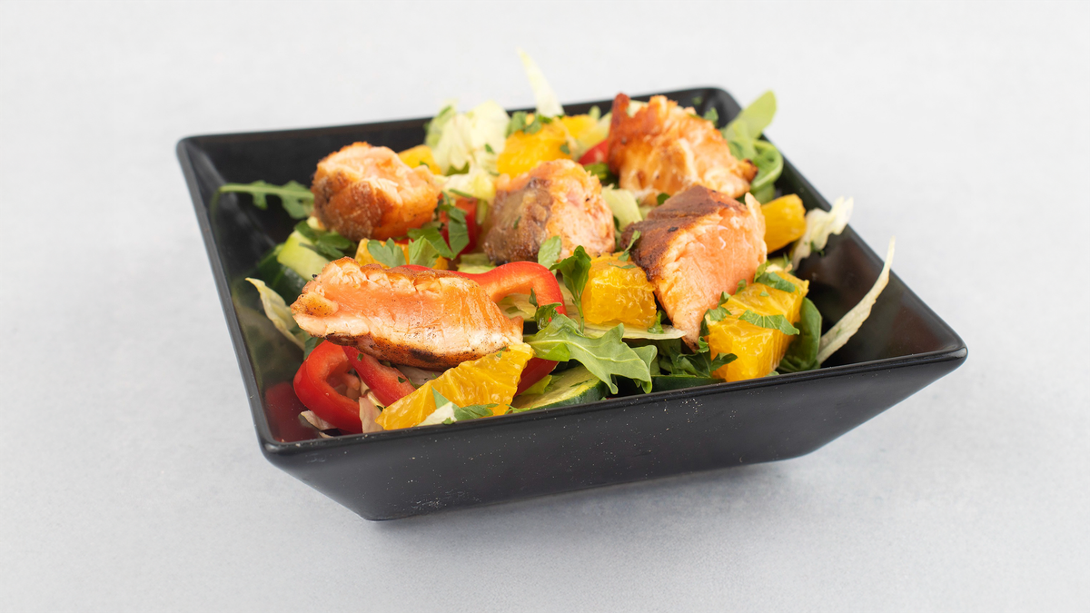 Uživajte u posnoj salati sa hrskavim povrćem i sočnim grilovanim lososom, obogaćenom osvežavajućim pomorandža dresingom.