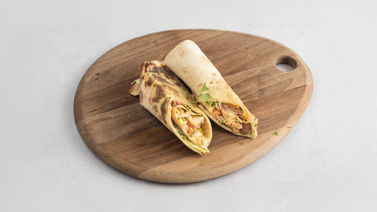 Pita hleb sa belim lukom, topljenimim sirom, mariniranom piletinom 130g, coleslaw salatom i humusom
