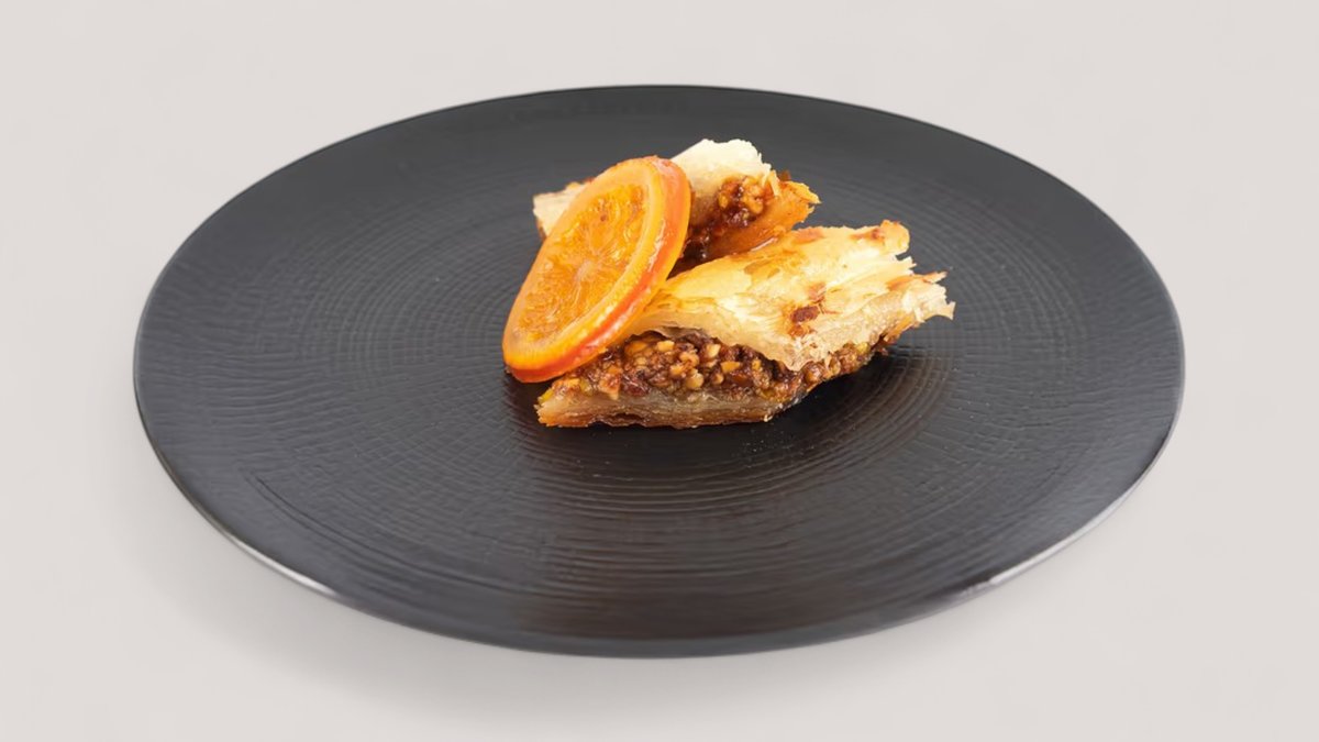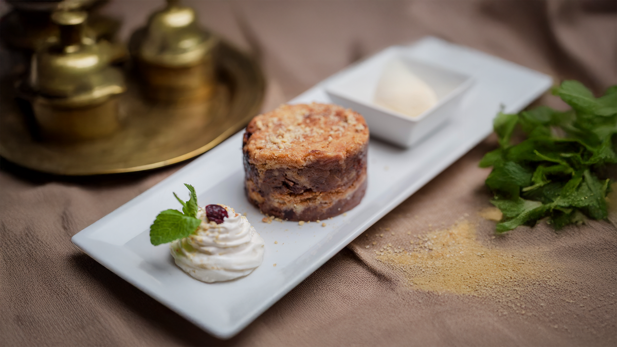 Koziji sir, dimljeni patližan u sosu od susama, masline, zaatar, peršun, paradajz, pita hleb