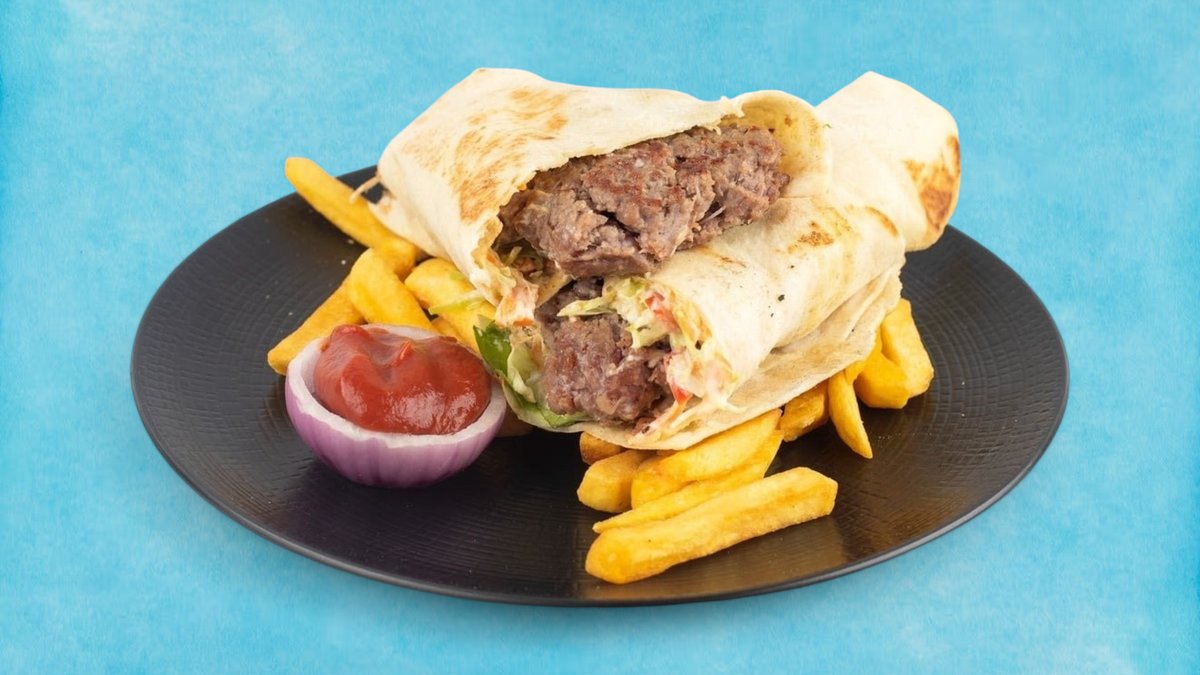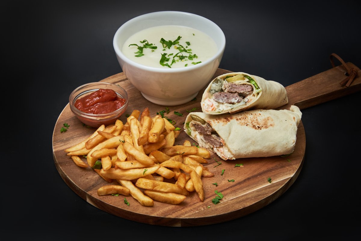 Libanski ćevap sa humusom i svežim povrćem u pita hlebu, uz prilog začinjeni začinjeni krompir i sos od paradajza i đumbira
