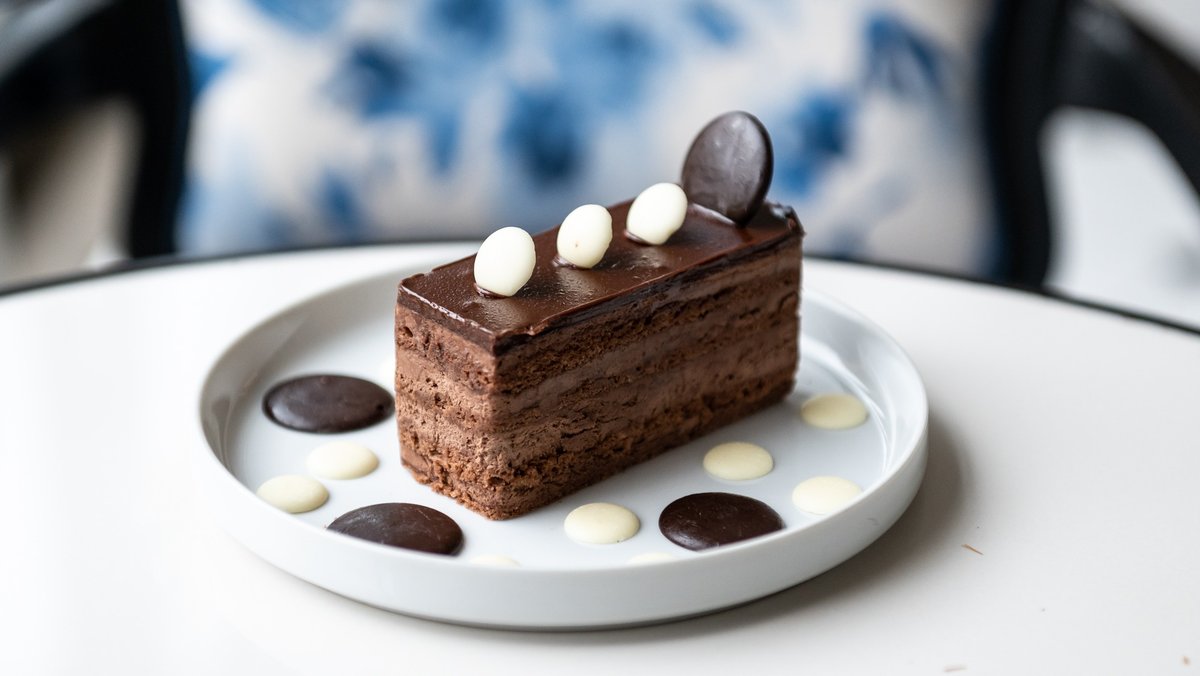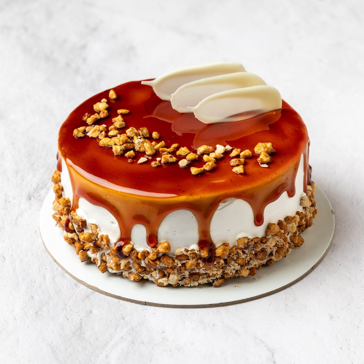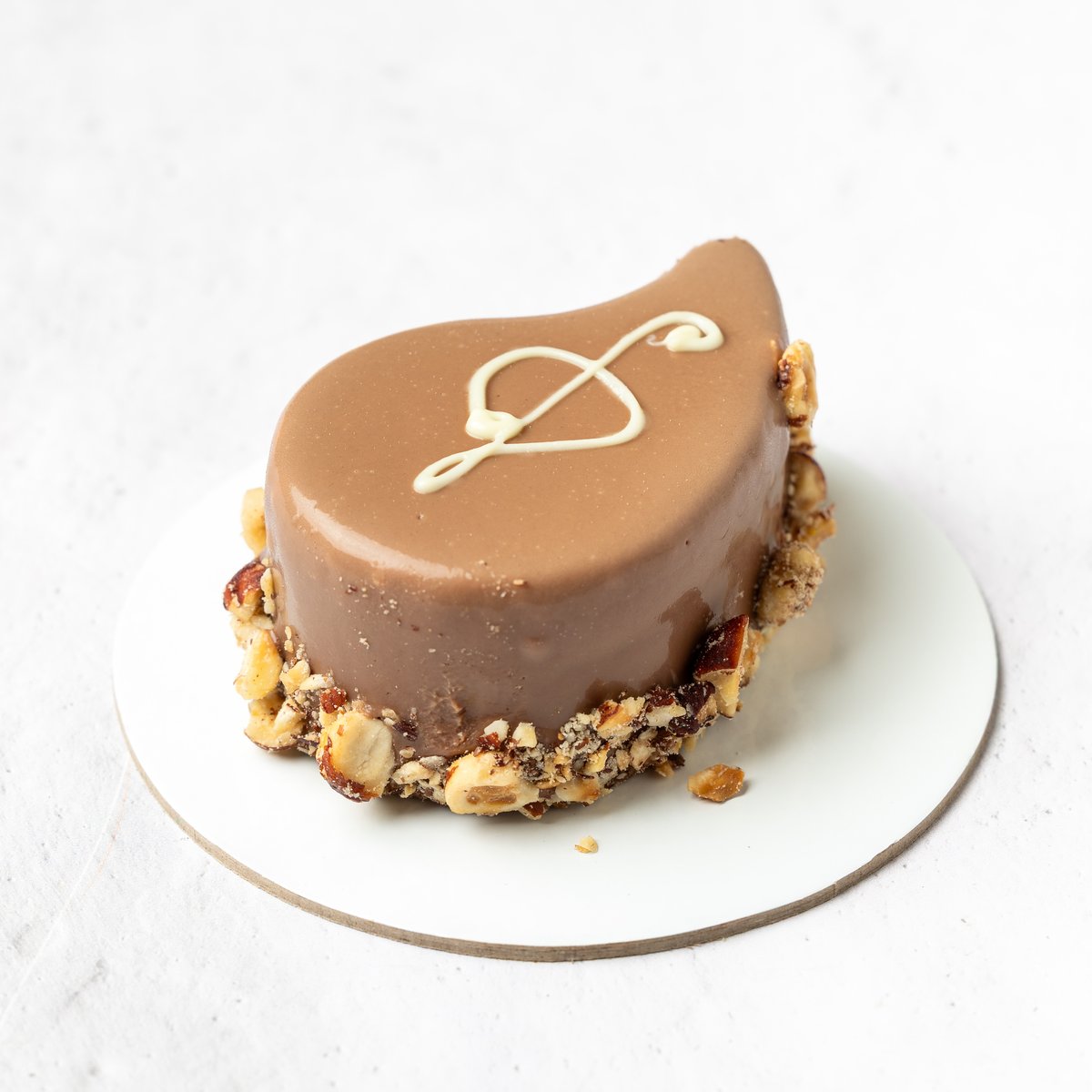 Intenzivan čokoladni mus sa blagom notom kafe, punjen tečnim karamel jezgrom i posut finim kakaom. Sa krckavom teksturom, ovaj umetnički desert je stvoren za ljubitelje čokolade, karamele i kafe.