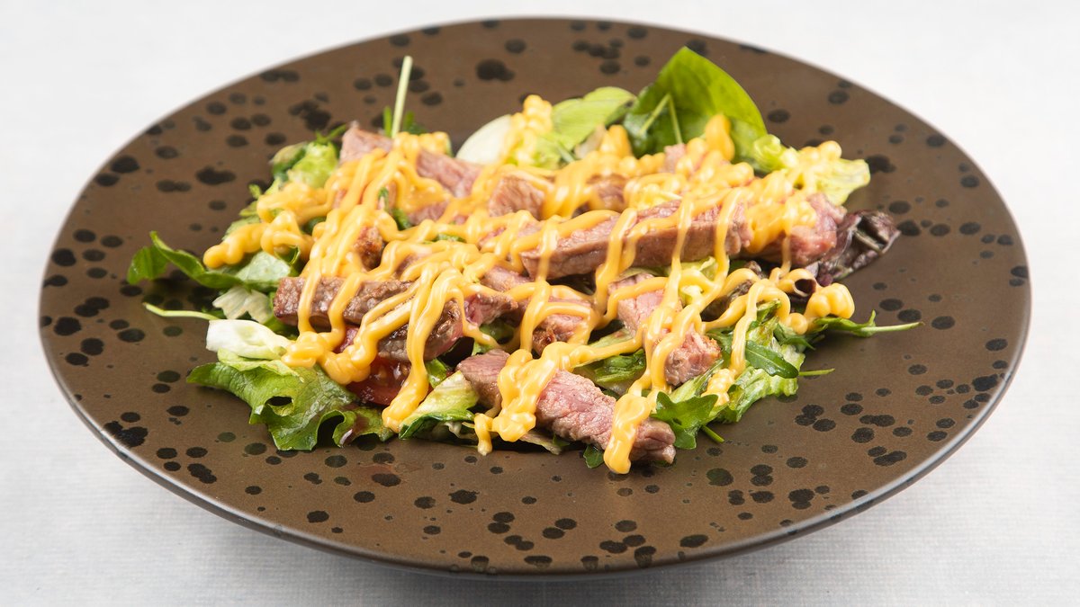 Ramstek, mix zelenih salata, rukola, čedar sir, čedar dresing, baby corn
