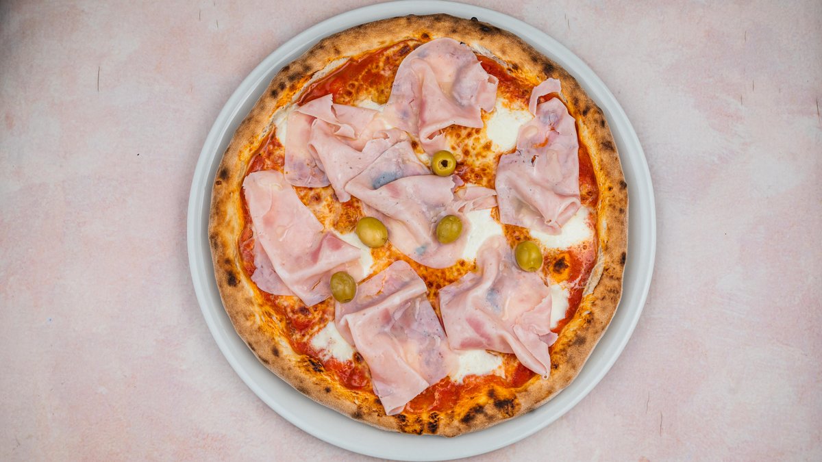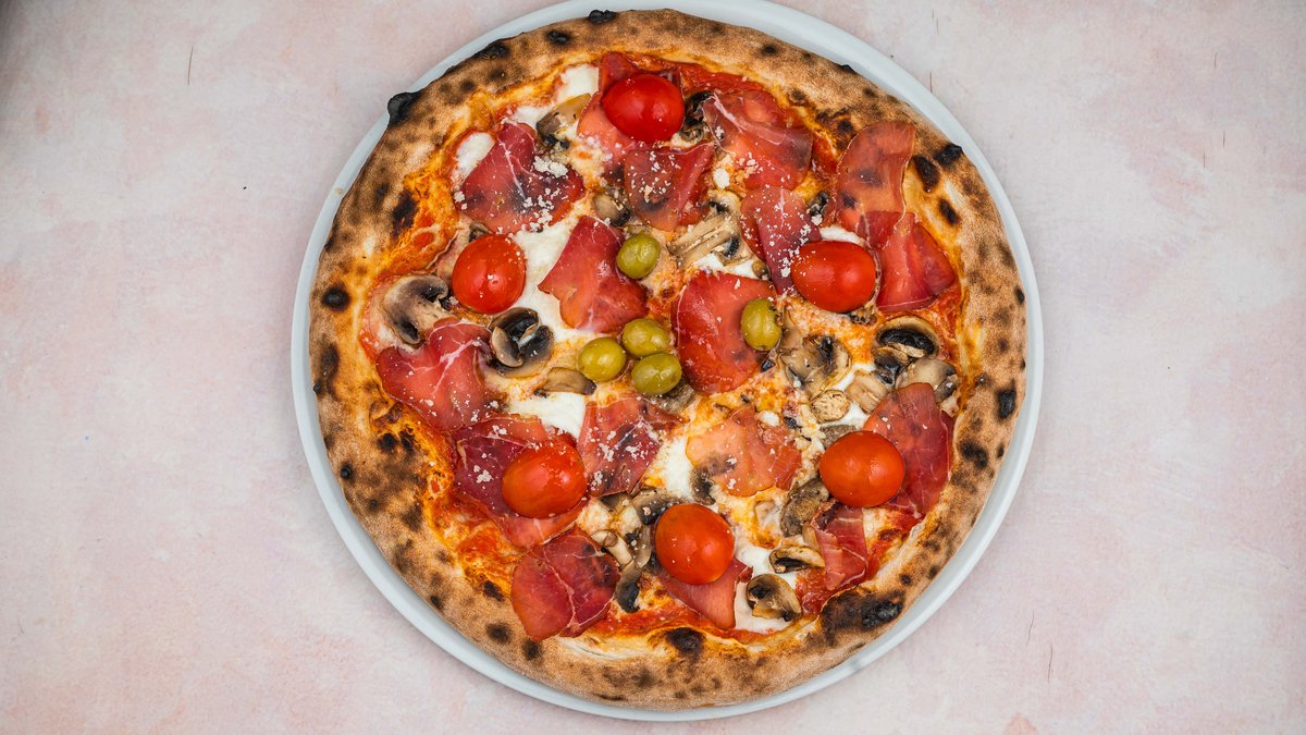 Pelat, mocarela, šunka, pečurke, ventrićina, pančeta, jaje, origano,masline, maslinovo ulje.