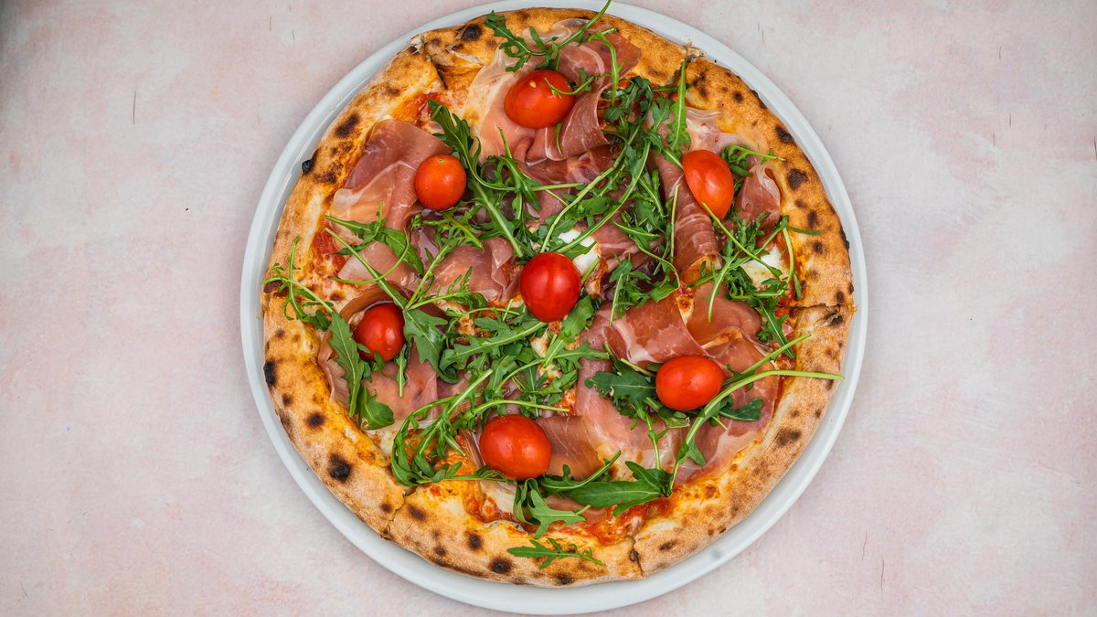 pelat, mocarela bufala, pečurke, gorgonzola, goveđa pršuta, rukola, čeri paradajz, grana padano, maslinovo ulje