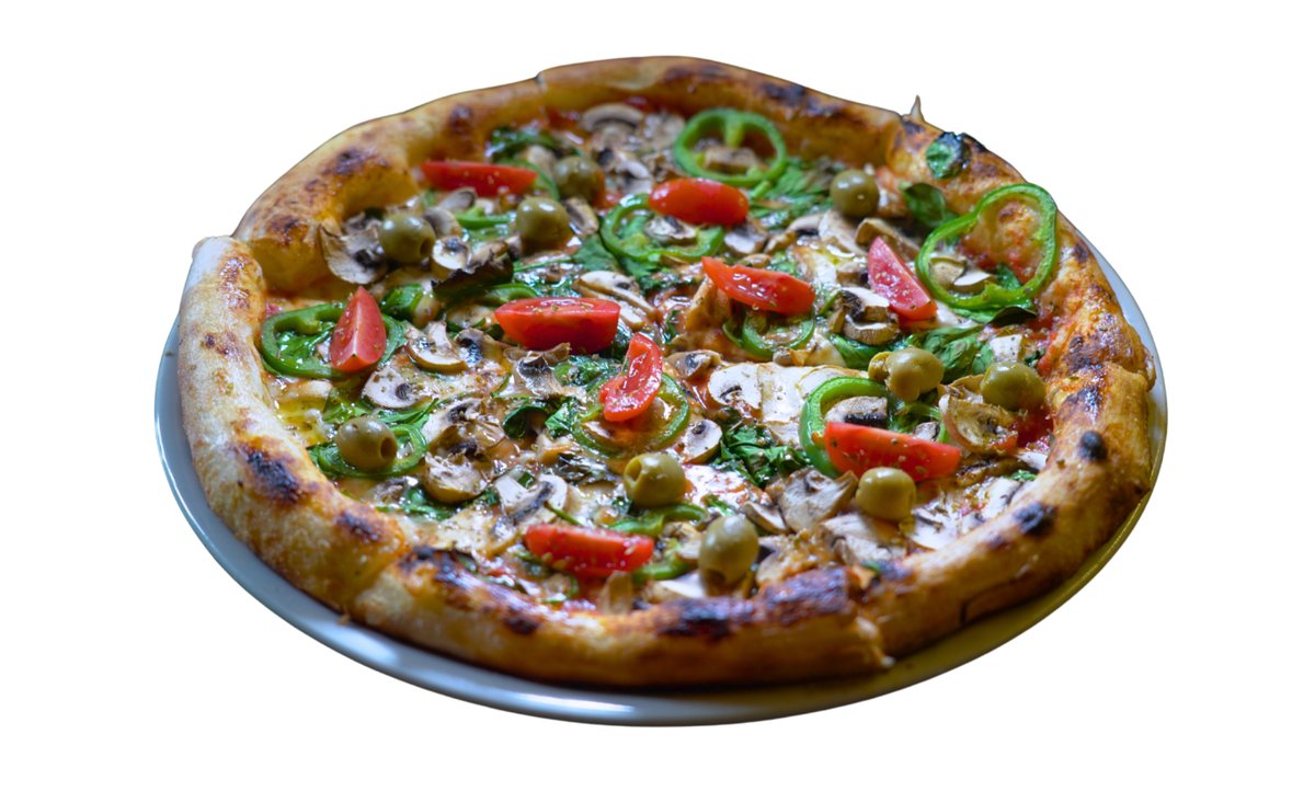 Pelat, mocarela, pečurke, spanać, sveža paprika, čeri paradajz,masline, origano, maslinovo ulje