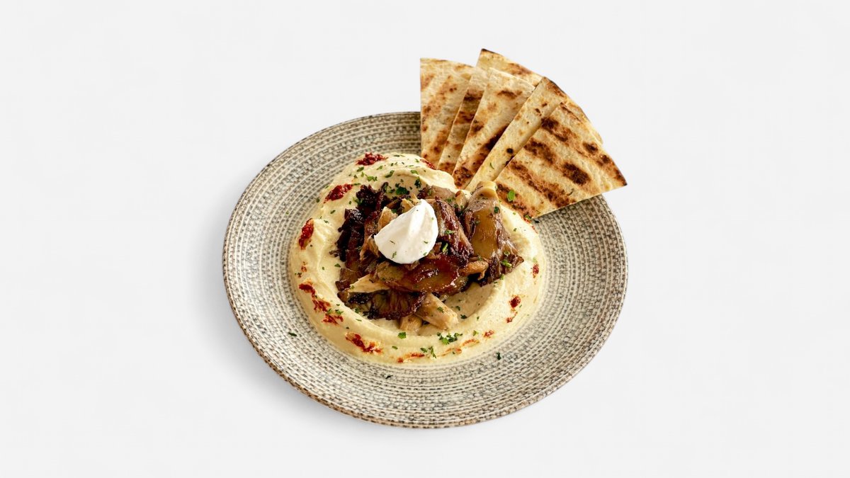 Homemade humus,oktopus,zelena salata,cherry paradajz,biber sos,sos beli luk,libanska tortilja,limeta