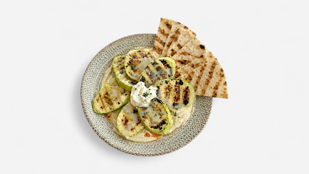 Homemade humus,grilovane tikvice,tahini,biber sos,beli luk sos,libanska tortilja