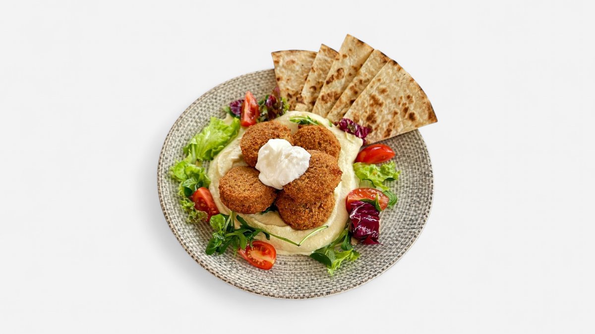 Homemade humus,hrskavi falafel,zelena salata,cherry paradajz,sos beli luk