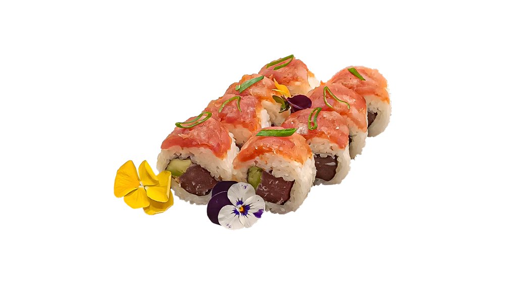 Tuna, Cheddar sir, krastavac, spicy sos, unagi sos, susam. 8 komada