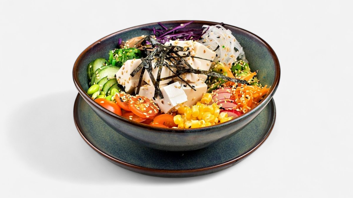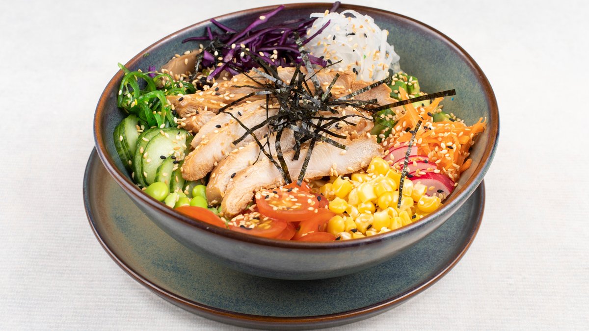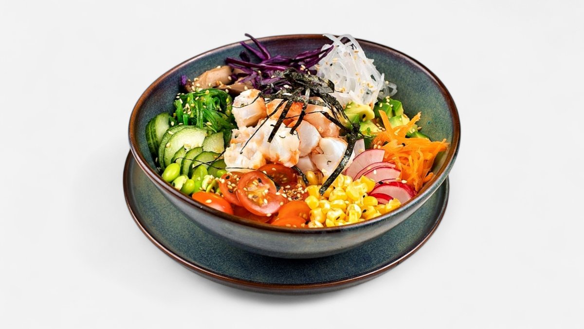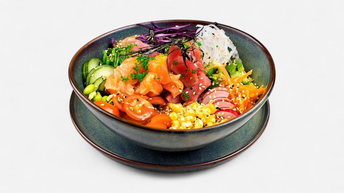 Losos, edamame, avokado, marinirani dajkon, slatki kukuruz, wakame, crveni kupus, krastavac, čeri paradajiz, šitake, rotkvica, susam, nori, pirinač, Ponzu sos