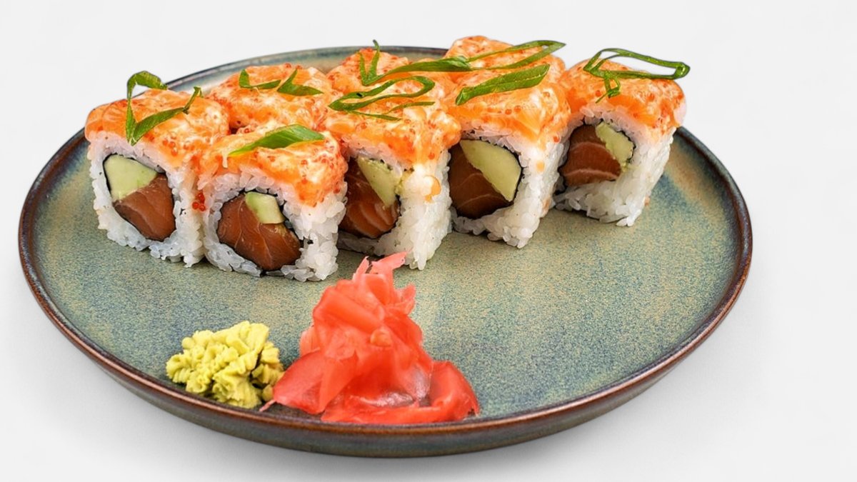 Losos, avokado, kapa od mešavine komadića lososa sa spicy sosom, tobiko i mladim lukom, 8 komada