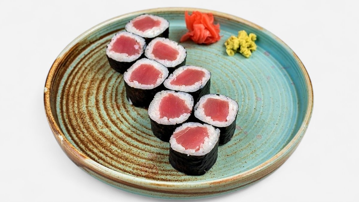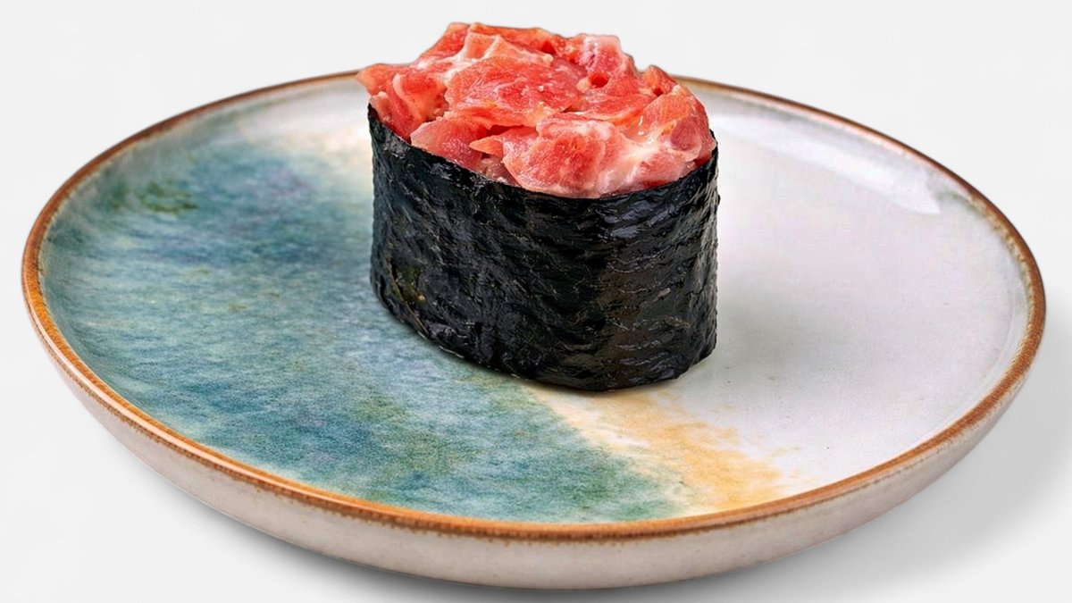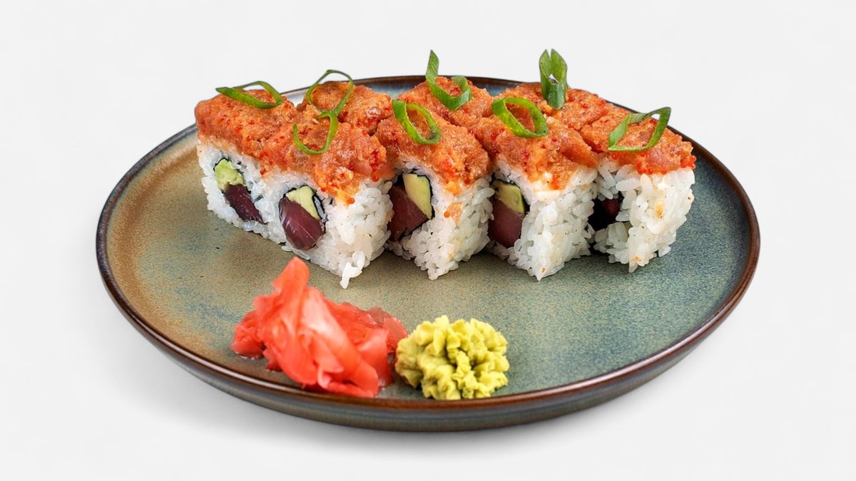 Sveza tuna, avokado, kapa od mešavine komadića tunjevine sa spicy sosom, tobiko i mladim lukom, 8 komada