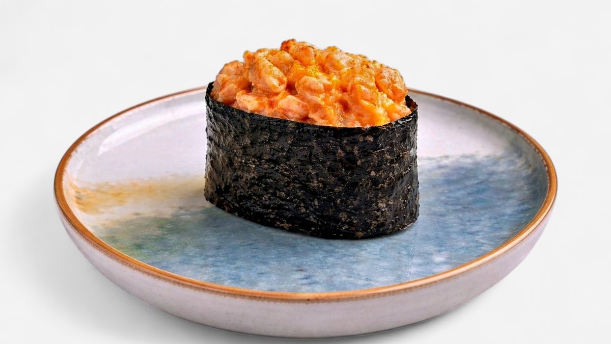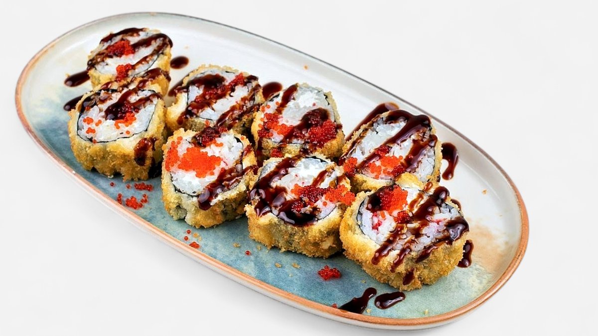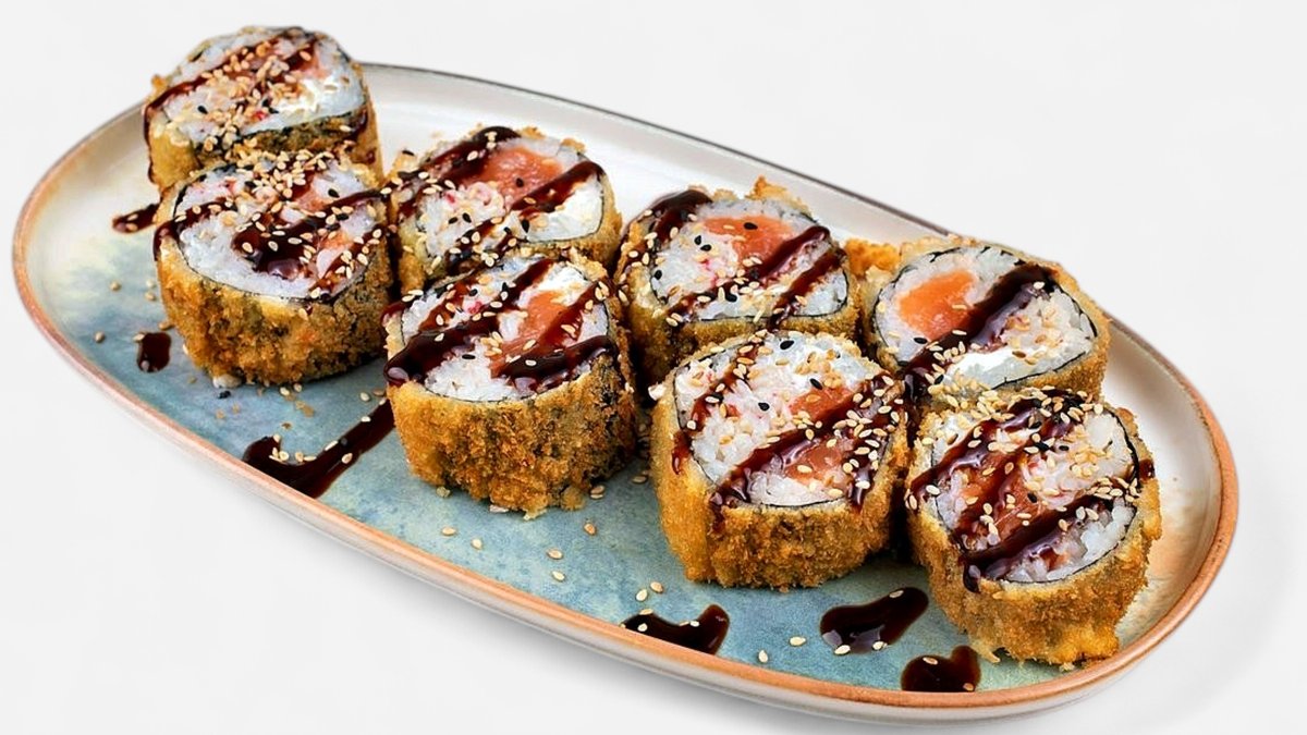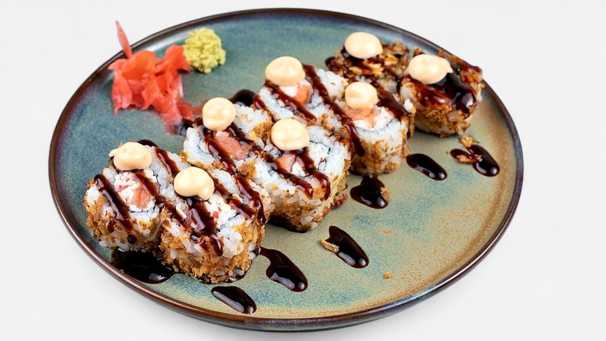 Snezna kraba, dimleni losos, spicy sos, hrskavi luk, susam, unagi sos. 8 komada