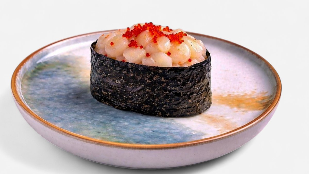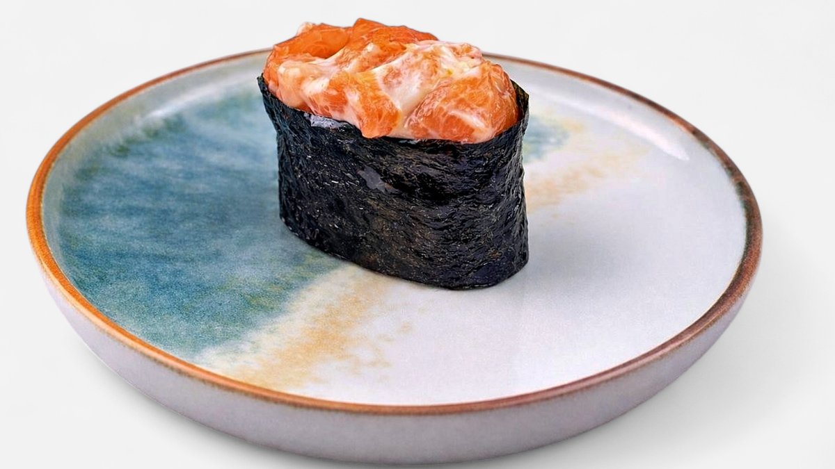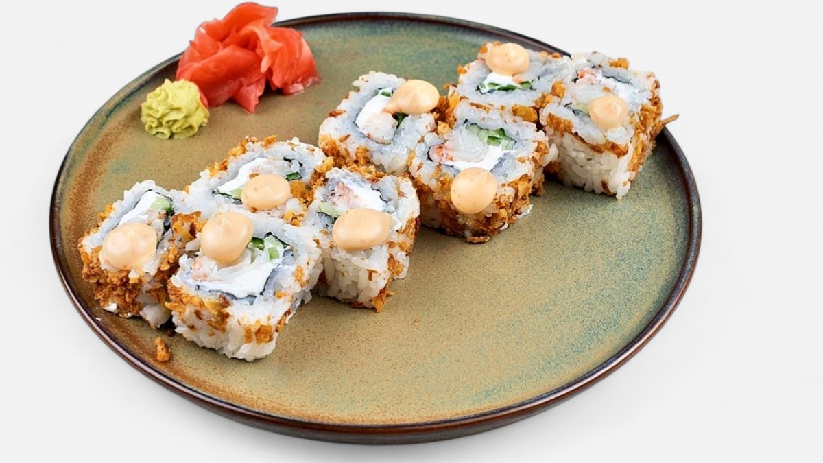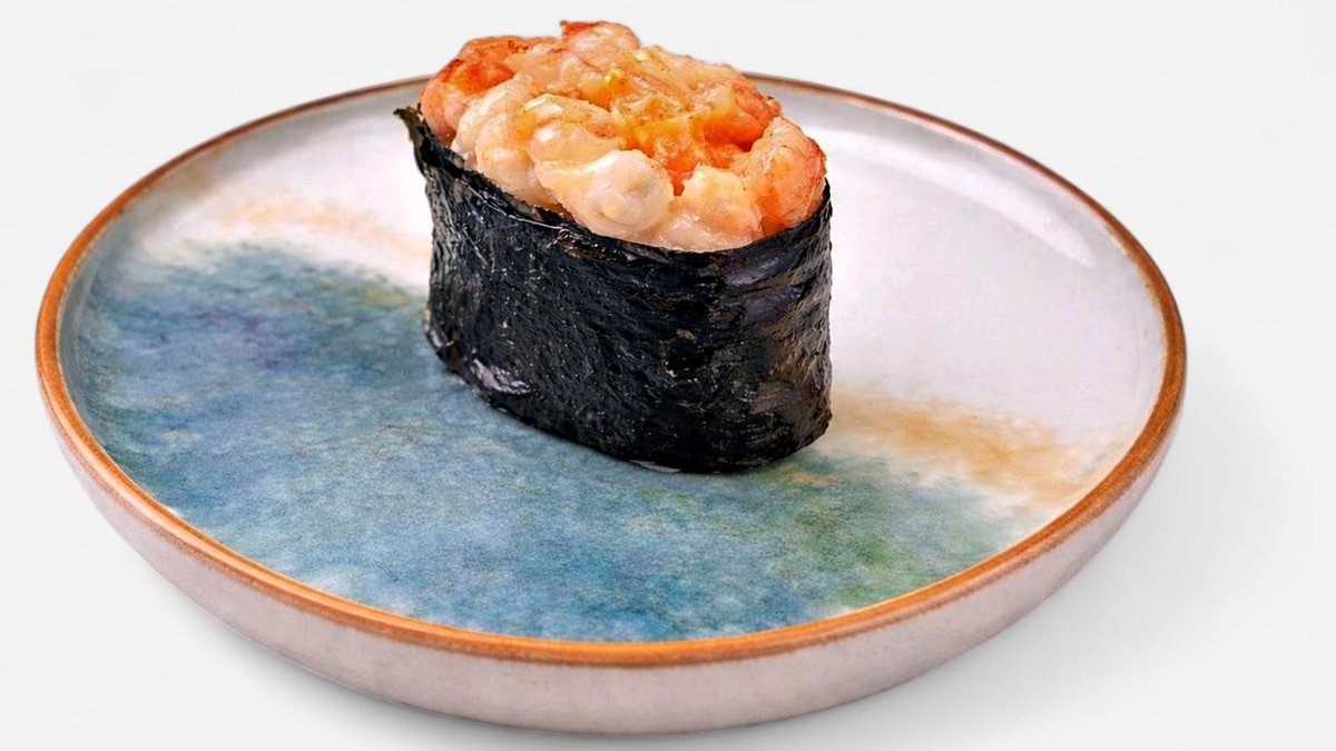 Snezna kraba, dimleni losos, spicy sos, hrskavi luk, susam, unagi sos. 8 komada
