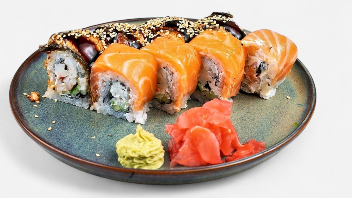 40 komada: - Hosomaki rolnica sa prženim lososom, krastavcom, avokadom i kapom od sira Filadelfija - Uramaki rolnica sa prženim lososom, wakame, tobiko i sirom Filadelfija. - Rolnica sa sa prženim lososom, sirom Filadelfija i kapom od lososa i tobiko caviarom. - Rolnica sa prženim lososom, sirom Filadelfija, pokrivaena avokadom, susamom i Unagi sosom. - Tempura rolnica sa prženim lososom, zelenim salatom, sirom Filadelfija, crvenim tobiko, susamom i Unagi sos