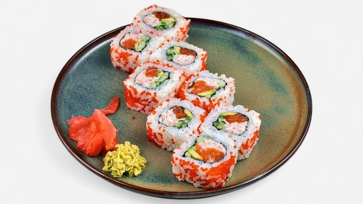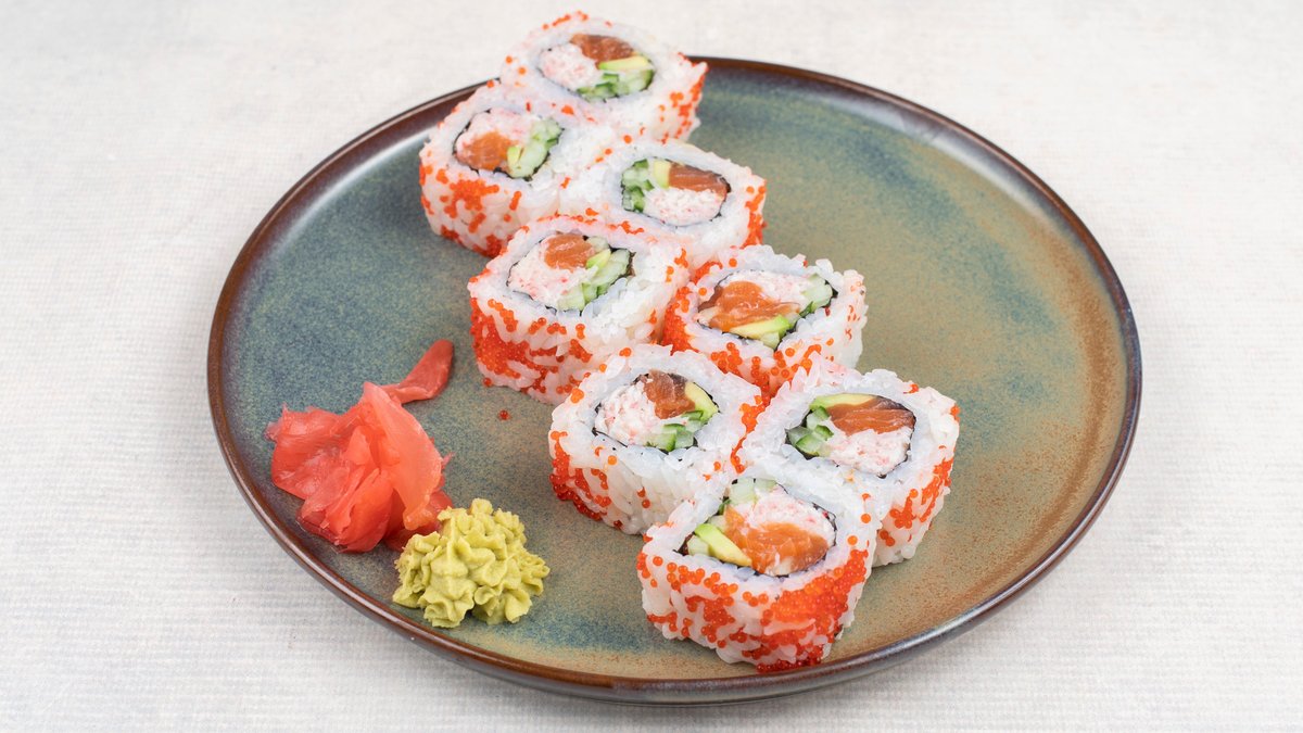 Losos, snezna kraba, krastavac, avokado, krem sir, tobiko. 8 komada