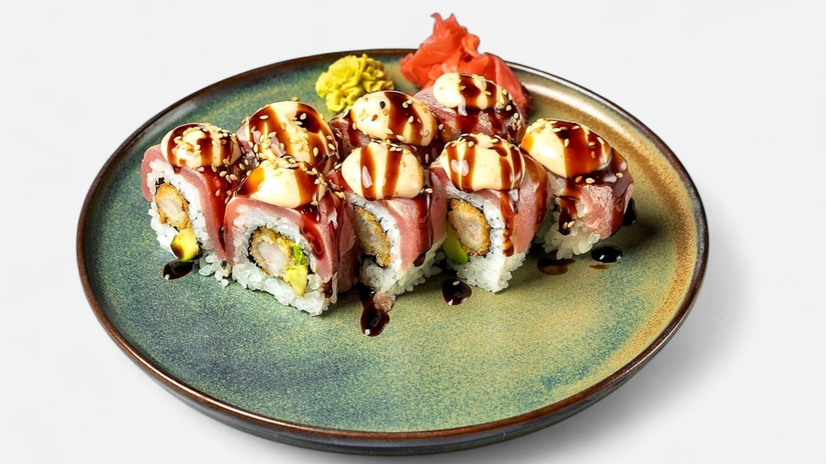 Tempura kraljevski gambori, avokado, brenirana tuna, spicy sos, unagi sos, susam. 8 komada