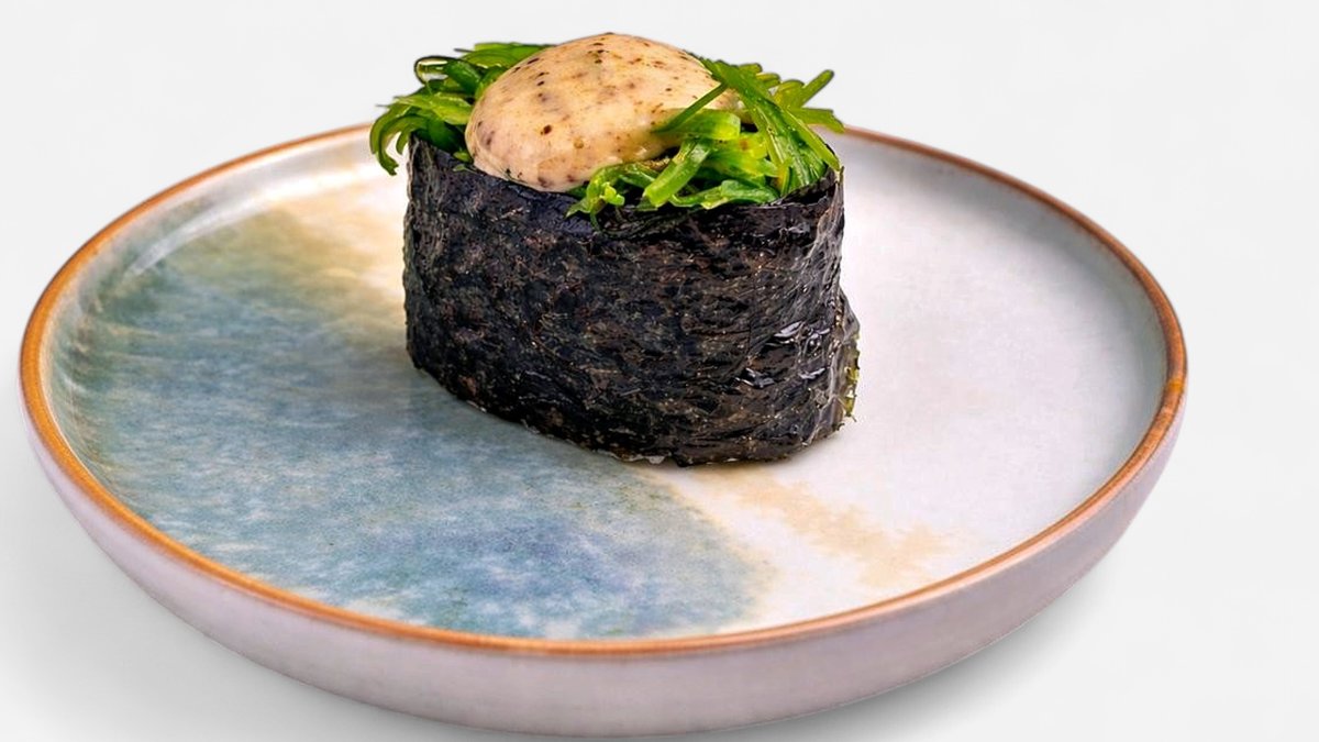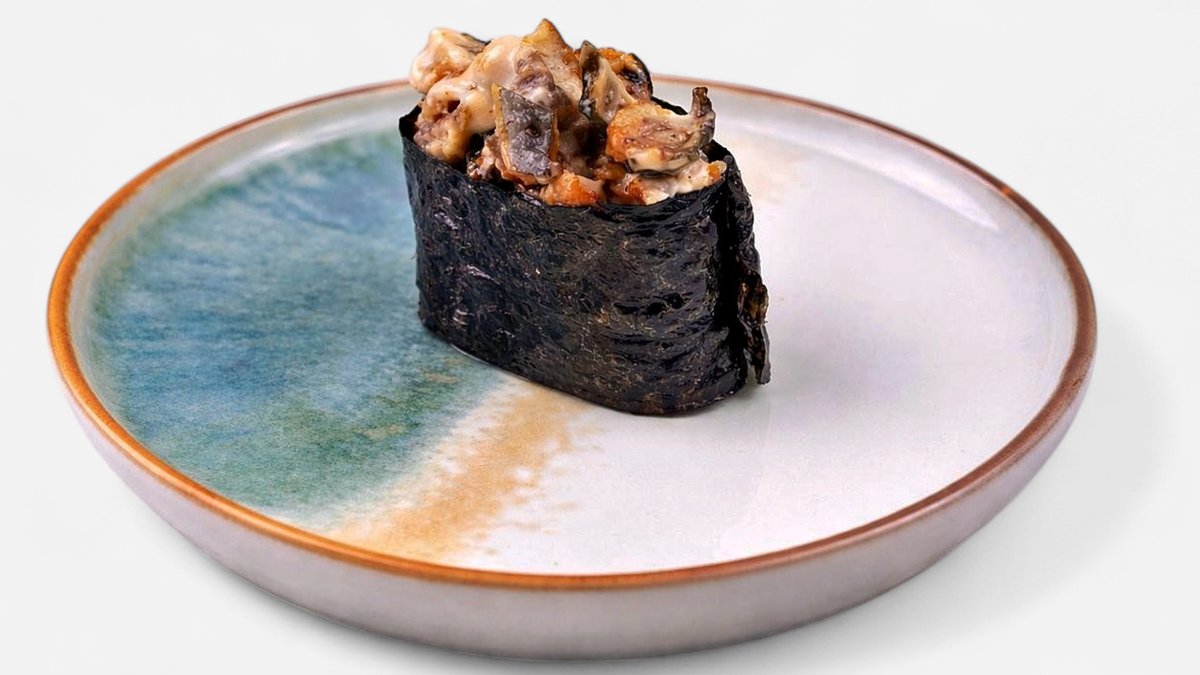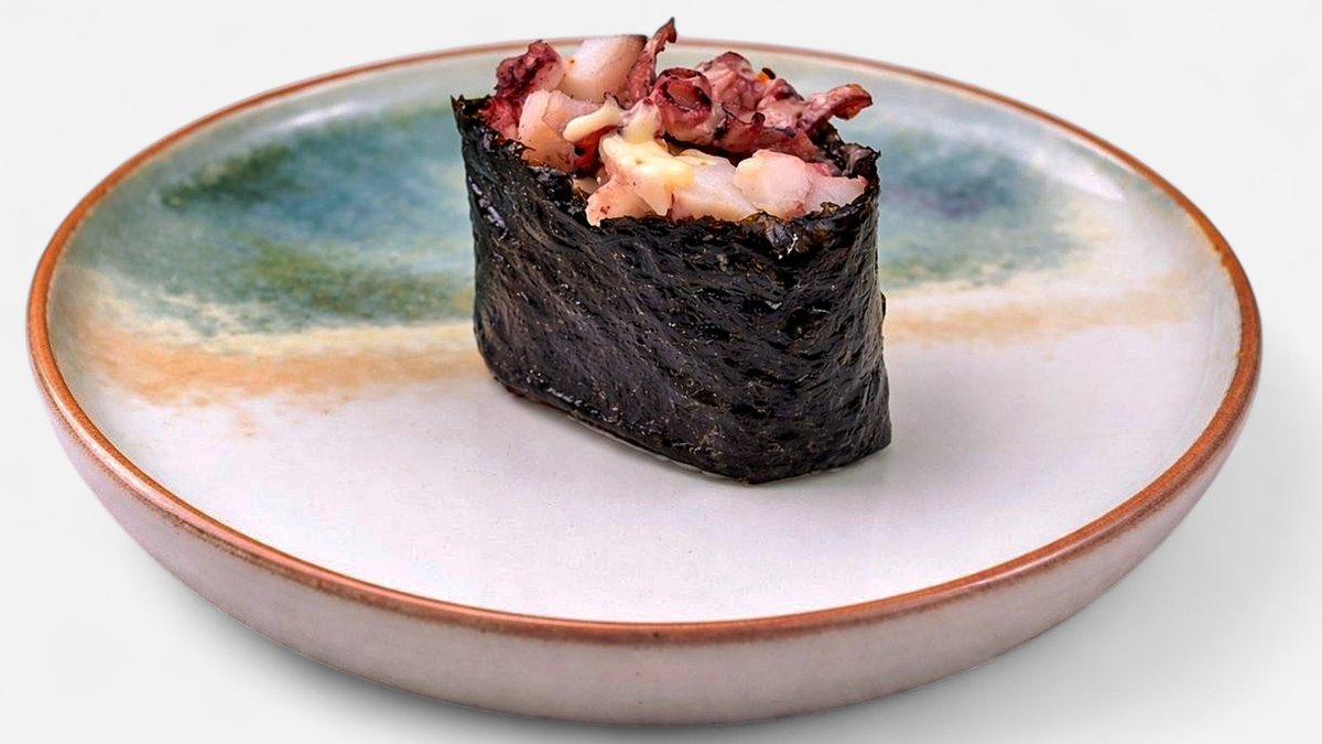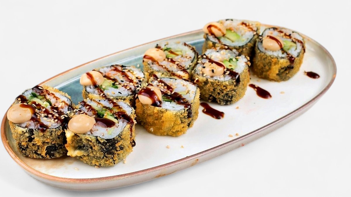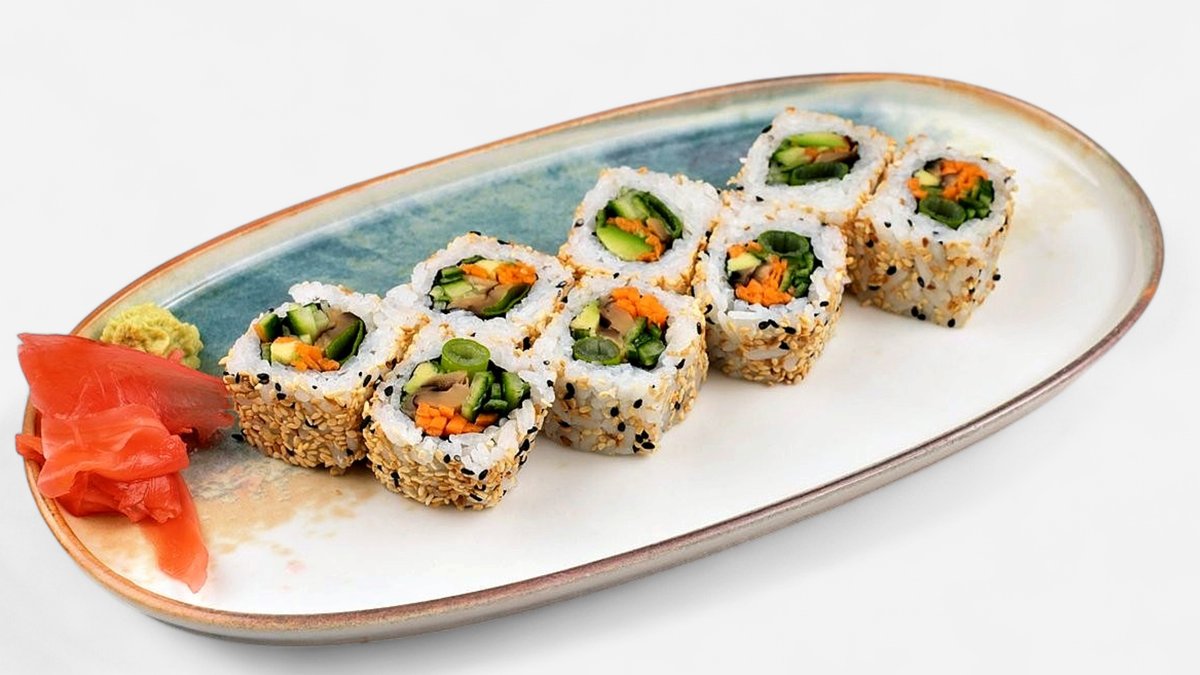 Avokado, kraljevski gambori, hobotnica, meso snežne krabe, krastavac, unagi sos, susam. 8 komada