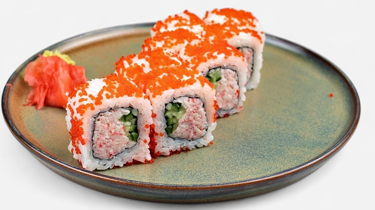 Snezna kraba, avokado, krastavac, tobiko, japanski majonez. 8 komada