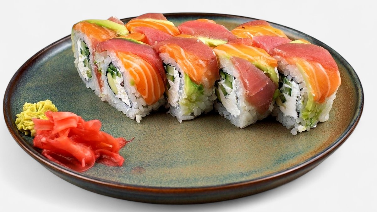 24 komada - Kalifornija kraljevski gambori 8 komada - gambori, krastavac, avokado, masago sos, tobiko crveni/narandžasti/ili zeleni - Filadelfija losos 8 komada - krem sir Filadelfija, krastavac, losos, susam - Rolnica Spicy Tuna 8 komada - tuna, krastavac, kapa od spicy tune, crno - beli susam