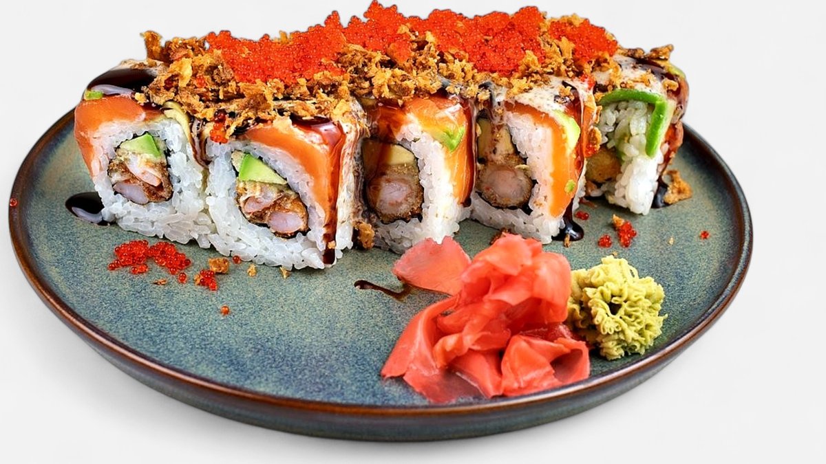 Pohovani gambori, losos, avokado, unagi sos, gommodare, hrskavi luk, tobiko. 8 komada