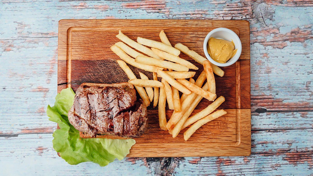Juneći biftek, pomfrit, pola somuna. Prilozi koje izaberete stavljamo u somun, nemamo mogućnosti da priloge pakujemo posebno.