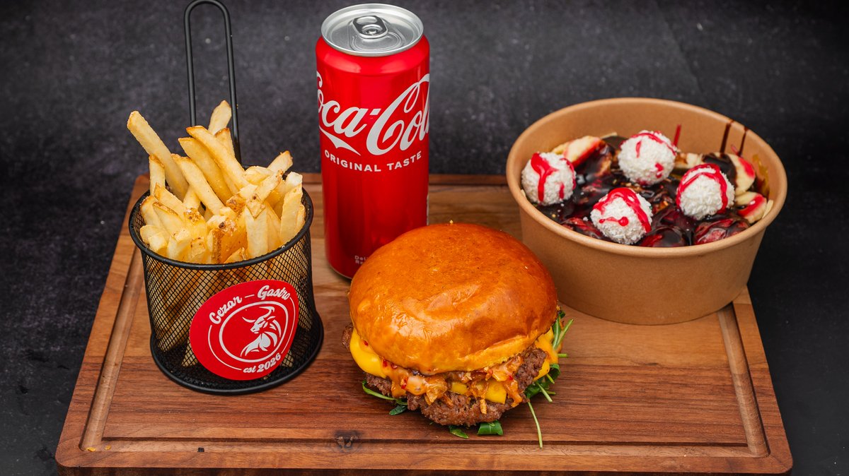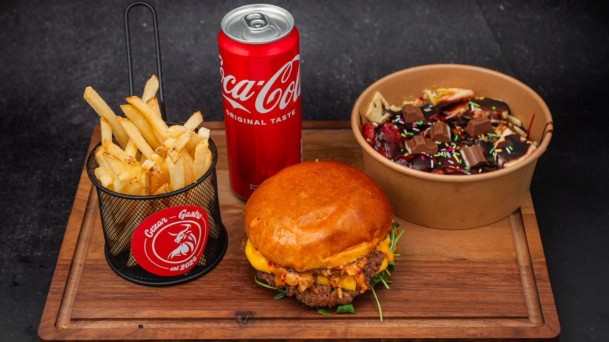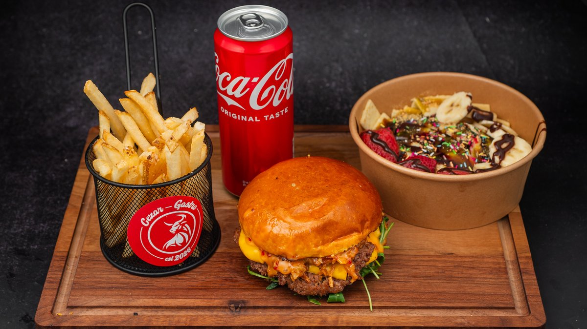Double burger, mali pomfrit, fettucine, sok po izboru