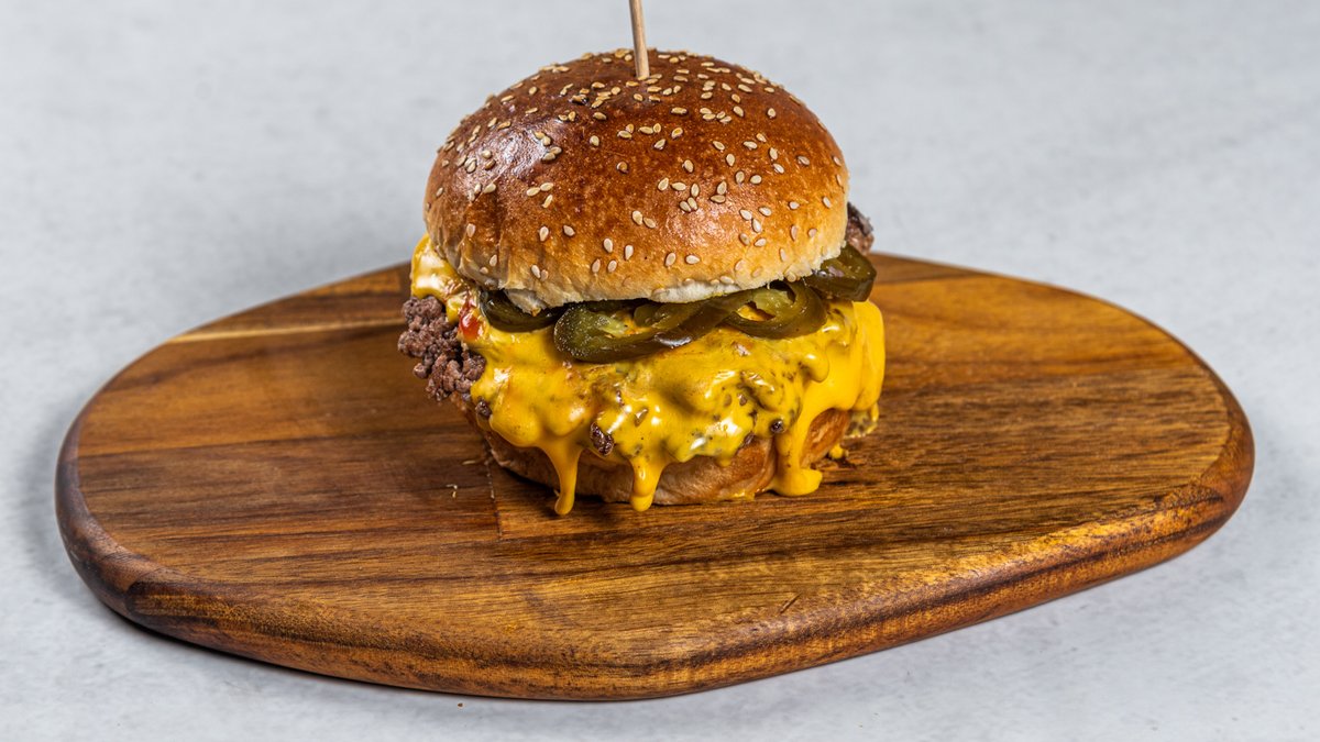 2x juneće meso, 2x čedar sir, kečap, senf, crveni luk, kiseli krastavac