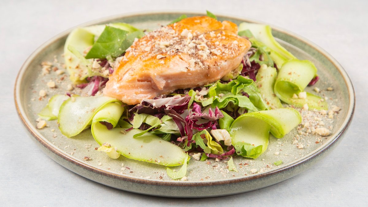 Losos, mix zelenih, kukuruz, tikvica, badem, lemon dressing