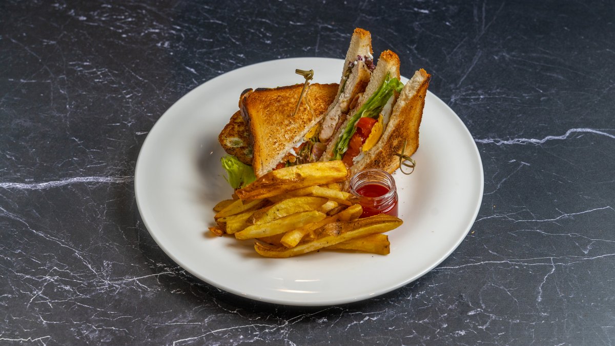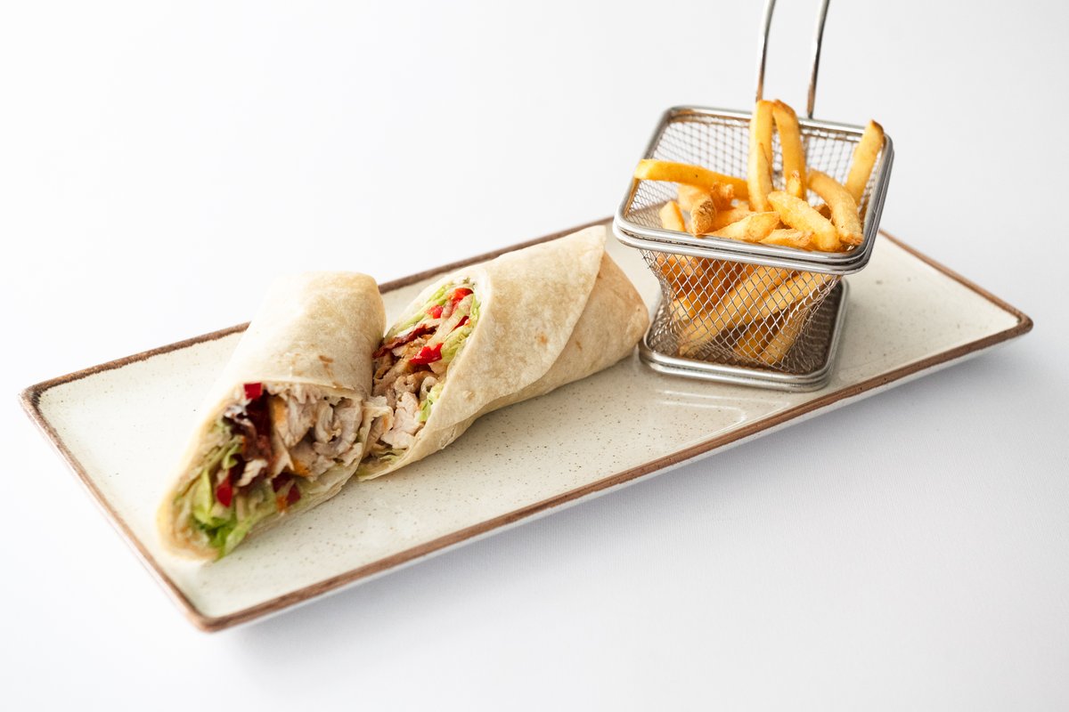 iceberg salata, sušeni paradajz, sveža paprika, namaz od krem sira, servirano sa pomfritom