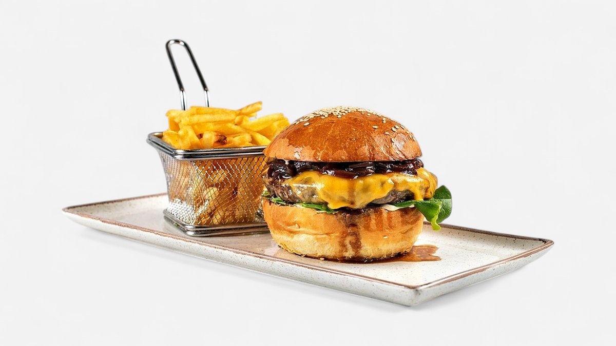 Goveđe mleveno meso, burger sos, karamelizovani luk, čedar, zelena salata i pomfrit