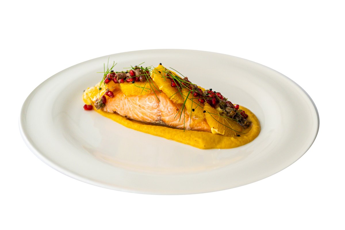 obogaćen karamelizovanim pomorandžama, salsom od kapra, narom i mirođijom
