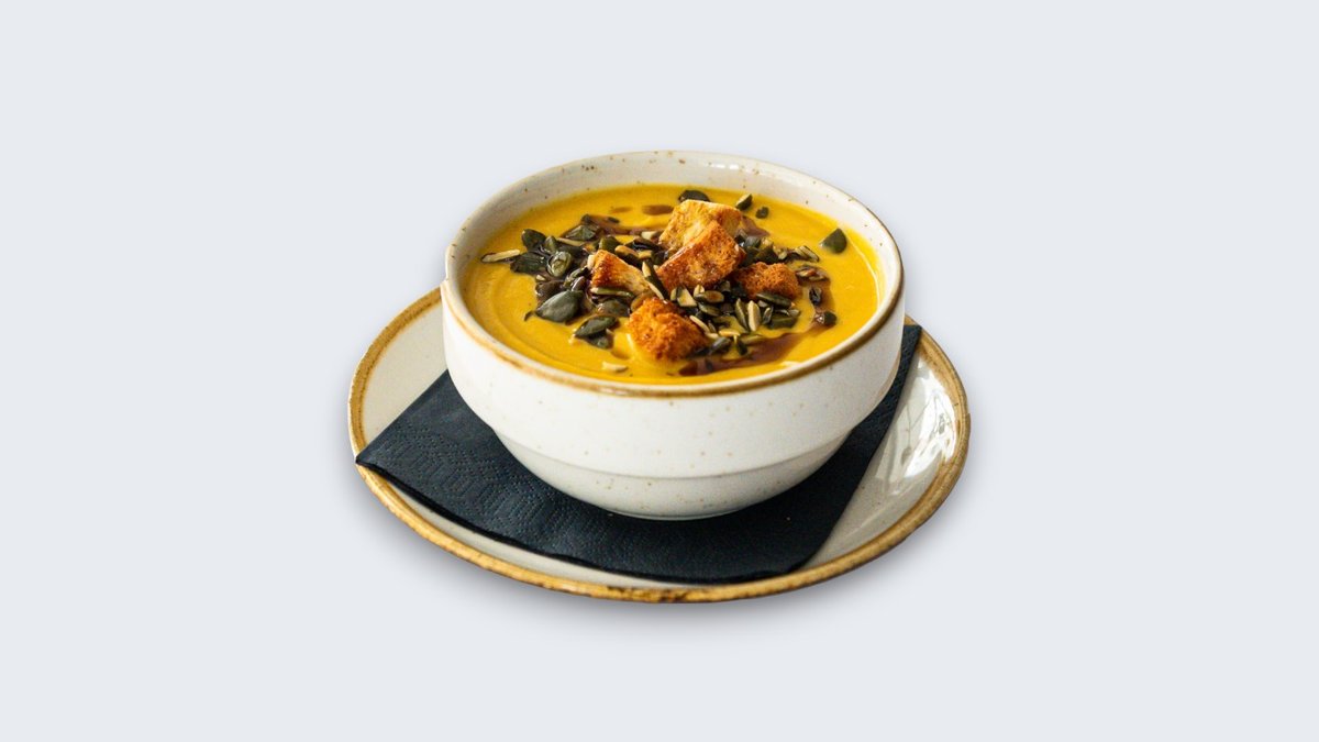 Potaž od bundeve serviran sa krutonima od belog luka i uljem od semena bundeve