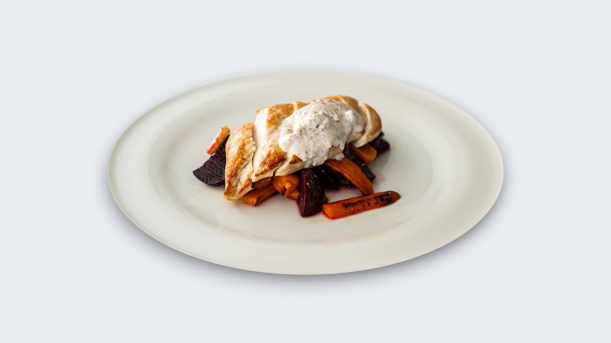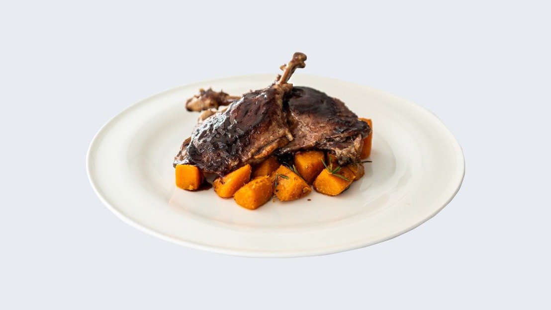 Glaziran sosom od crvenog vina, serviran uz batat sa ruzmarinom