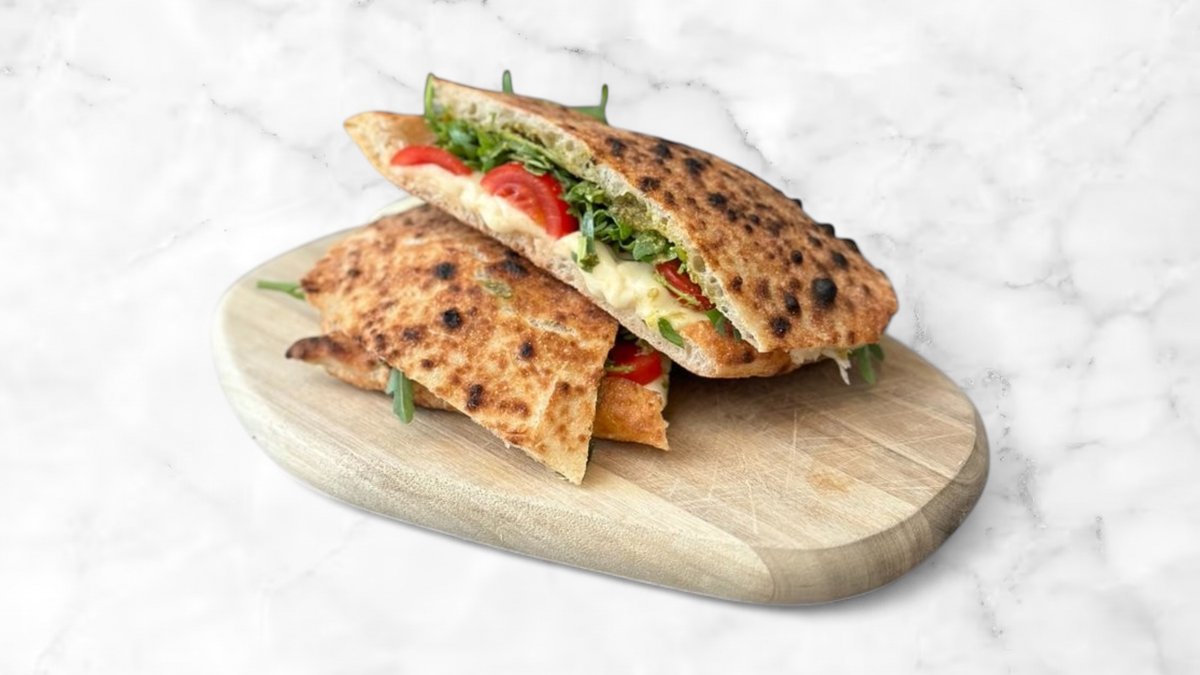 Namaz od pesta, rukola, fior di latte mocarela, čeri paradajz, parmigiano reggiano
