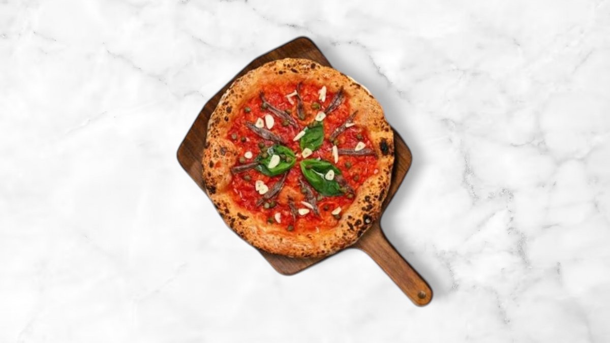 San Marzano pelati, inćuni, kapar, origano, sveži beli luk, maslinovo ulje, bosiljak